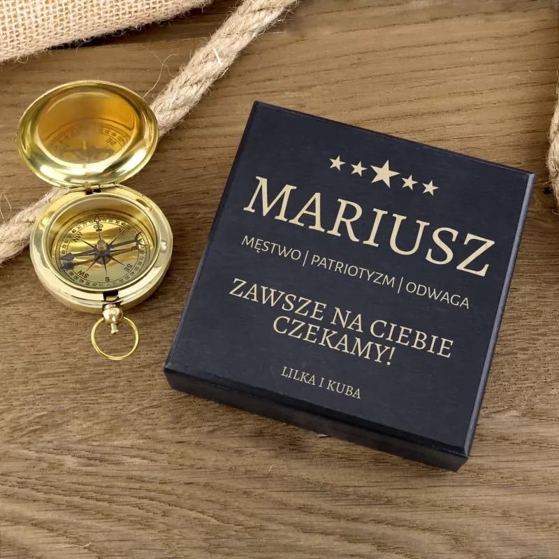 Przedstawiamy idealny prezent dla żołnierza, który bez wątpienia będzie dla niego pamiątką dla długie lata. Nasz kompas z grawerem w drewnianej skrzynce sprawdzi się idealnie w roli upominku dla wojskowego. Wspaniała dedykacja o patriotycznym charakterze opatrzoną Twoim podpisem na pewno będzie przypominać mu rodzinny dom. To doskonały prezent dla żołnierza na przysięgę, czy z okazji urodzin. Parametry Kompas średnica: 4,5 cm materiał: mosiądz diamentowy grawer personalizacji kompas stylizowany na antyczny, co nadaje mu unikalny charakter Kompas wykonany jest z metalu stylizowanego na antyczny, co nadaje mu unikalny charakter i wyjątkowy wygląd. Ze względu na zastosowane materiały (np. mosiądz, miedź lub ich stopy), z czasem może wystąpić naturalny proces patynowania lub zaśniedzenia powierzchni – zwłaszcza w przypadku długotrwałego przechowywania w zamkniętym pudełku, bez dostępu powietrza. Aby zachować estetykę i trwałość kompasu, zalecamy jego regularny przegląd oraz delikatną konserwację, np. przetarcie suchą, miękką ściereczką lub zastosowanie specjalnych preparatów do pielęgnacji metalu. Przechowywać w suchym miejscu, unikać wilgoci. Pudełko wymiary: 10 x 10 x 3 cm kolor: granat materiał: drewno laserowy grawer personalizacji Powierzchnia pudełka może odznaczać się drobnymi wgłębieniami wynikającymi ze struktury drewna oraz naturalnych słojów. Personalizacja Aby w pełni spersonalizować prezent, skorzystaj z naszego edytora. Wprowadź odpowiednie dane, a nasi graficy zajmą się resztą.