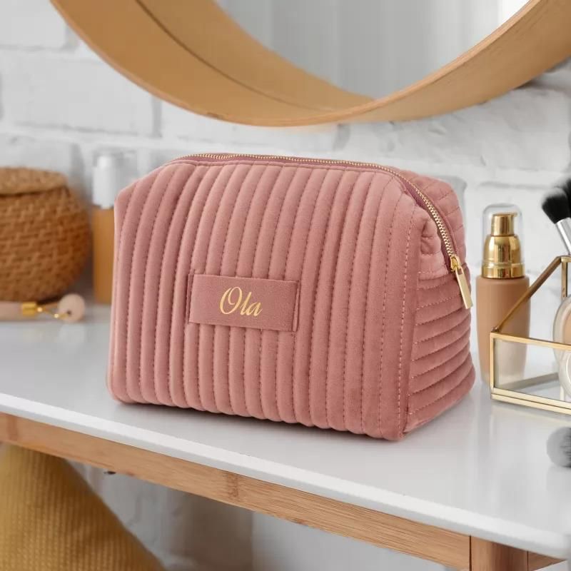 Ta elegancka kosmetyczka damska na pewno spełni oczekiwania każdej kobiety! Wykonana z aksamitnego i przyjemnego w dotyku materiału, jest duża i pojemna, idealna do przechowywania ulubionych kosmetyków zarówno w domu, jak i w podróży. To doskonały prezent dla każdej kobiety, która ceni sobie estetykę i praktyczność. Parametry kosmetyczka damska podróżna wymiary: ok. 16 x 17 x 22 cm wykonana z miękkiego materiału kolor: brudny różowy posiada jedną pojemną przegrodę wnętrze wykończone łatwą w czyszczeniu czarną podszewką nadruk personalizacji w kolorze złotym Personalizacja Aby w pełni spersonalizować prezent, skorzystaj z naszego edytora. Wprowadź odpowiednie dane, a nasi graficy zajmą się resztą.