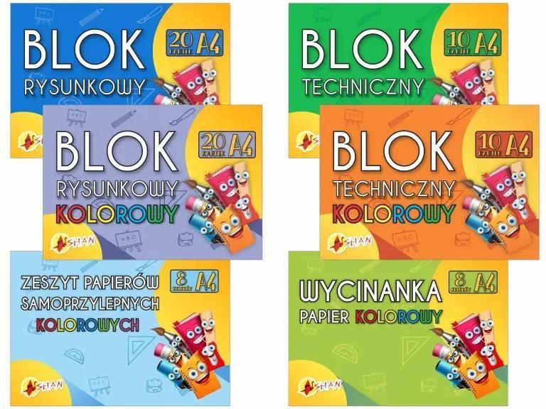 Komplet bloków szkolnych + wycinanka +samoprzylepny A4 Shan 6 szt. Komplet bloków szkolnych A4 zawiera: Blok rysunkowy A4 biały - 20 arkuszy Blok rysunkowy A4 kolorowy - 20 arkuszy - Papier barwiony w masie dzięki czemu kolory są żywe, po przecięciu środek też jest w kolorze oraz papier nie czuć farbą jak przy tanich blokach z kartkami malowanymi. Blok techniczny A4 biały - 10 arkuszy Blok techniczny A4 kolorowy - 10 arkuszy - Papier barwiony w masie dzięki czemu kolory są żywe, po przecięciu środek też jest w kolorze oraz papier nie czuć farbą jak przy tanich blokach z kartkami malowanymi. Zeszyt papierów samoprzylepnych A4 Pastelowe - 8 arkuszy Zeszyt do wycinanek A4 - 8 arkuszy Produkt polski Papier do bloków rysunkowych białych ma gramaturę minimum 100g/m2 Papier do bloków technicznych białych ma gramaturę minimum 190 g/m2 Papier do bloków kolorowych jest barwiony w masie dzięki czemu kolory są żywe, po przecięciu środek też jest w kolorze oraz papier nie czuć farbą jak przy tanich blokach z kartkami malowanymi farbą. Papier do bloków rysunkowych staramy się aby był tylko o gramaturze 120 g/m2 ale może się trafić jakiś kolor w niższej gramaturze. Papier do bloków technicznych kolorowych jest od 160 g/m2 do 240 g/m2 w zależności od dostępnego materiału na produkcji. Wycinanka jest nabłyszczana na papierze kredowych 115 g/m2 Papier samoprzylepny kolorowy ma gramaturę 180 g/m2 z podkładem ( to jest ta warstwa ochronna którą się odkleja i wyrzuca).