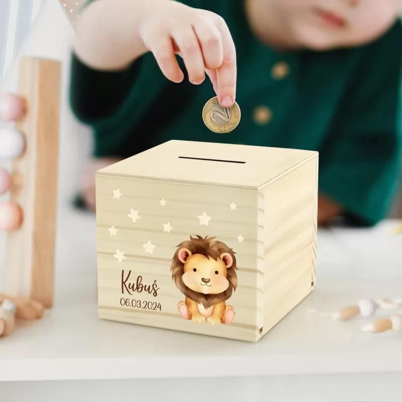Skarbonka drewniana z nadrukiem dla dziecka - Lew Stalowa Wola