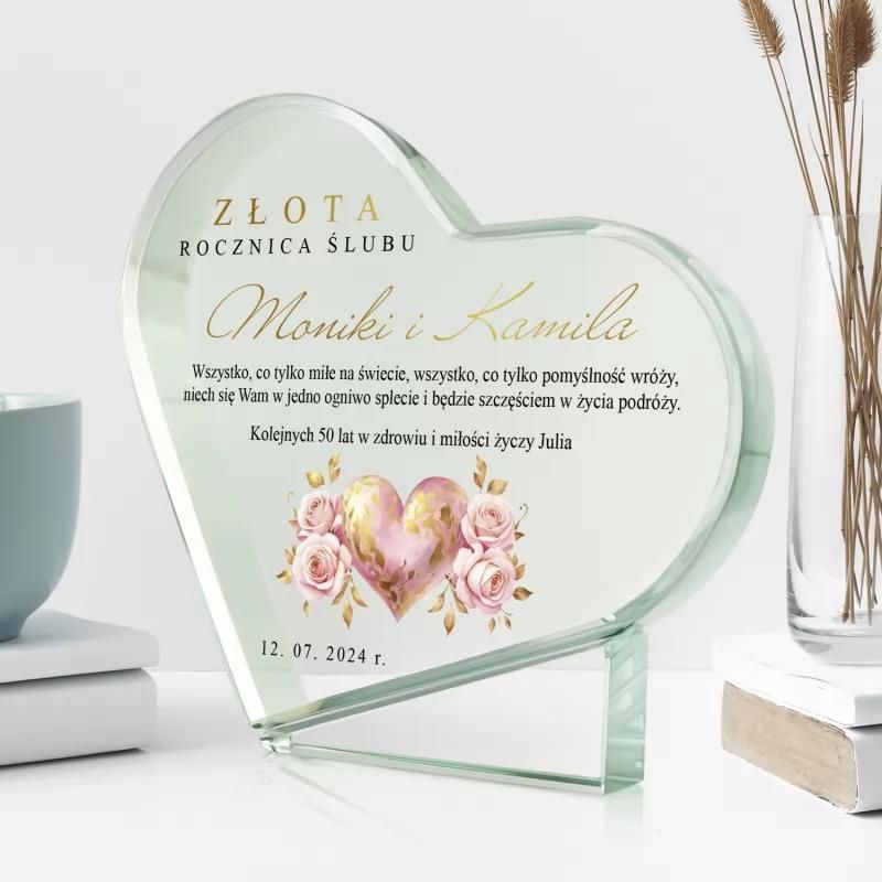 Statuetka szklana serce z nadrukiem na 50 rocznicę ślubu - Złote Gody Stalowa Wola