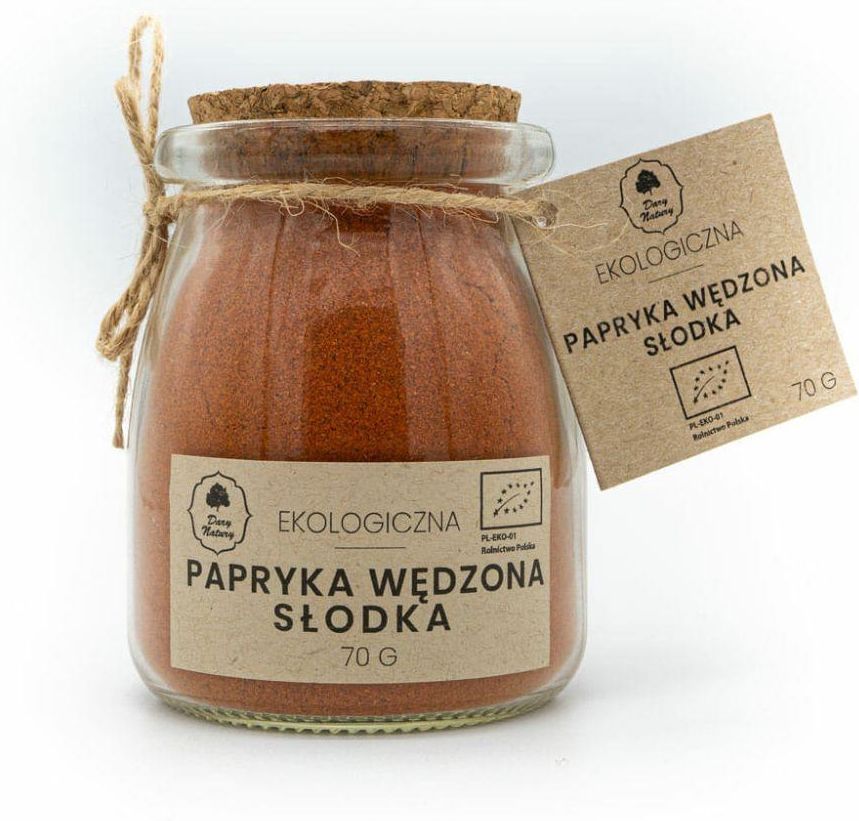 Dary Natury Słoiczek Papryka Wędzona Słodka Eko 70g Papryka Wędzona Słodka Eko 70g od Dary Natury to wyjątkowa przyprawa, która wzbogaci smak Twoich potraw. Dzięki swoim intensywnym walorom, ta ekologiczna papryka wędzona jest idealnym wyborem dla osób, które cenią sobie naturalne i zdrowe składniki. Jej unikalny dymny smak sprawia, że doskonale komponuje się w potrawach różnych kultur, od polskiej, przez hiszpańską, aż po meksykańską. Rodzaj i forma przyprawy Papryka wędzona słodka dostępna jest w praktycznym słoiczku o pojemności 70 g. Jest to przyprawa w formie mielonej, uzyskana z ekologicznie uprawianej papryki, która przeszła tradycyjny proces wędzenia. Cechuje się intensywnym czerwonym kolorem oraz wyrazistym dymnym smakiem, co czyni ją doskonałym dodatkiem do zup, sosów, mięs, ryb oraz warzyw. Dzięki temu, że wzbogaca grillowane dania, papryka Eko jest idealnym składnikiem do tworzenia pełnowartościowych posiłków. Skład Wybór przyprawy powinien zawsze opierać się na znajomości jej składu. Papryka wędzona słodka, oferowana przez Dary Natury, składa się w 100% z ekologicznej papryki, co czyni ją produktem w pełni naturalnym. Nie zawiera żadnych dodatków, konserwantów ani sztucznych substancji, co czyni ją idealnym wyborem dla osób z alergiami oraz tych, którzy preferują zdrowe i naturalne składniki w swojej diecie. Dodatkowo, papryka ta jest produktem wegańskim i wegetariańskim, co sprawia, że może być z powodzeniem stosowana przez wszystkich, niezależnie od preferencji żywieniowych. Cechy produktu Papryka wędzona słodka Dary Natury to produkt, który wyróżnia się kilkoma istotnymi cechami, które warto uwzględnić: Nie zawiera cukru – idealna dla osób dbających o zdrową dietę, Nie zawiera soi – bezpieczna dla osób z nietolerancjami pokarmowymi, Produkt wegański – doskonały wybór dla miłośników roślinnych składników, Produkt wegetariański – odpowiednia dla wszystkich, którzy unikają mięsa. Wielkość opakowania Ekologiczna papryka wędzona słodka dostępna jest w słoiczku o pojemności 70 g, co czyni ją idealnym rozwiązaniem dla osób, które regularnie korzystają z tej przyprawy. Praktyczne opakowanie chroni produkt przed wilgocią, co pozwala na dłuższe zachowanie jego aromatu i świeżości. Jak wykorzystać paprykę wędzoną słodką? Papryka wędzona słodka to wszechstronny składnik, który można wykorzystać na wiele sposobów. Oto kilka propozycji, jak wzbogacić swoje dania tą aromatyczną przyprawą: Dodatek do zup – wzbogaca smak tradycyjnych zup, nadając im głębię i dymny aromat. Sosy – świetnie sprawdza się w sosach, zarówno tych do mięs, jak i wegetariańskich. Grillowane potrawy – idealna do marynat oraz przyprawiania mięs i warzyw grillowanych. Potrawy jednogarnkowe – doskonała do dań jednogarnkowych, które zyskują na aromacie w wyniku dodania papryki. Sałatki – można nią wzbogacić smak sałatek, nadając im kolor i wyrazistość. Papryka wędzona słodka to przyprawa, która z pewnością wzbogaci Twoją kuchnię. Dzięki jej naturalnemu składowi i wszechstronności w zastosowaniach kulinarnych, każdy posiłek nabierze wyjątkowego charakteru.