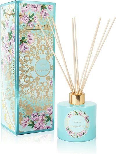 Dyfuzory zapachowe Max Benjamin są ręcznie produkowane w Hrabstwie Wicklow w Irlandii. Niezwykle aromatyczna mieszanka najwyższej jakości olejków zapachowych została zamknięta w pięknym porcelanowym pojemniku i zapakowana w eleganckie pudełko. Twój ulubiony zapach będzie uwalniał się przez okres nawet 4 miesięcy – siłę zapachu możesz dowolnie regulować ilością umieszczanych w pojemniku patyczków. Aby w pełni cieszyć się swoim ulubionym zapachem wystarczy od czas do czasu wyjąć patyczki z pojemnika i obrócić je góra-dół. Dyfuzor zapachowy Max Benjamin nie zawiera alkoholu, a każda mieszanka zapachów jest budowana w trosce o alergików, dlatego nasze produkty mają bardzo niski poziom alergenów. Zapach Acqua Viva znany jest z kolekji Amalfi, który na życzenie klientów powrócił w ramach kolekcji Classic. Acqua Viva to świeży i energetyzujący zapach z wyraźną górną nutą zapachową łączącą czarną porzeczkę z cytrusami jak pomarańcza, mandarynka i cytryna. Głównym zapachem jest kardamon i pieprz, a bazę stanowi mieszanka piżma, ambry i drzewa cedrowego.