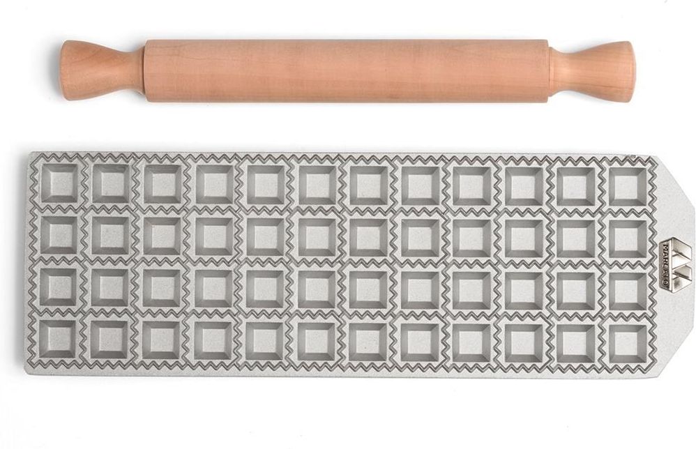Marcato Classic Line – Forma do Ravioli w Kwadratach 25 mm x 48 szt. + Wałek z litego drewna Klasyczna forma do ravioli Marcato umożliwia szybkie i łatwe przygotowanie aż 48 sztuk ravioli jednocześnie. Solidna konstrukcja zapewnia precyzyjne cięcie i wygodę użytkowania. Najważniejsze cechy Wysoka jakość wykonania – Korpus formy wykonany jest z odlewanego ciśnieniowo aluminium, materiału bezpiecznego dla żywności, który gwarantuje czyste i dokładne cięcie arkusza makaronu. Trwały wałek do ciasta – Do zestawu dołączony jest wałek z litego drewna, specjalnie dobranego dla zwiększonej trwałości i komfortu użytkowania. Łatwość czyszczenia – Po użyciu wystarczy pozostawić formę na 30 minut do wyschnięcia, a następnie oczyścić suchą szczotką. Dostępność różnych wariantów – Klasyczne formy do ravioli Marcato są dostępne w 6 różnych stylach, zarówno kwadratowych, jak i okrągłych, co pozwala na wybór idealnego rozwiązania do różnych przepisów. Marcato – gwarancja włoskiej jakości! W 100% wyprodukowane i zmontowane we Włoszech Korpus z odlewanego ciśnieniowo aluminium Wałek z litego drewna Dostępne w 6 różnych stylach Dostępne warianty Okrągły – 12 szt. x 55 mm Okrągły – 24 szt. x 40 mm Kwadrat – 24 szt. x 50 mm Kwadrat – 24 szt. x 35 mm Kwadrat – 36 szt. x 35 mm Kwadrat – 48 szt. x 25 mm Idealna forma do ravioli dla miłośników włoskiej kuchni – sprawdzi się zarówno w domowej, jak i profesjonalnej kuchni! Marcato Lifestyle Kuchnia to miejsce spotkań z bliskimi, przestrzeń, gdzie po całym dniu pracy zbieramy się przy stole, by cieszyć się wspólnym czasem. Powinna być miejscem relaksu i rodzinnej atmosfery, dostosowanym do człowieka. Od 1930 roku Marcato z pasją tworzy produkty, które przynoszą radość ludziom. Kultura zdrowego odżywiania to pierwszy krok w stronę dobrego samopoczucia, a makaron z prostych i naturalnych składników jest symbolem diety śródziemnomorskiej. Wszystkie produkty Marcato są stworzone dla tych, którzy cenią doskonałe wykonanie i dla tych, którzy odkryli na nowo przyjemność zdrowego, bezpiecznego jedzenia.