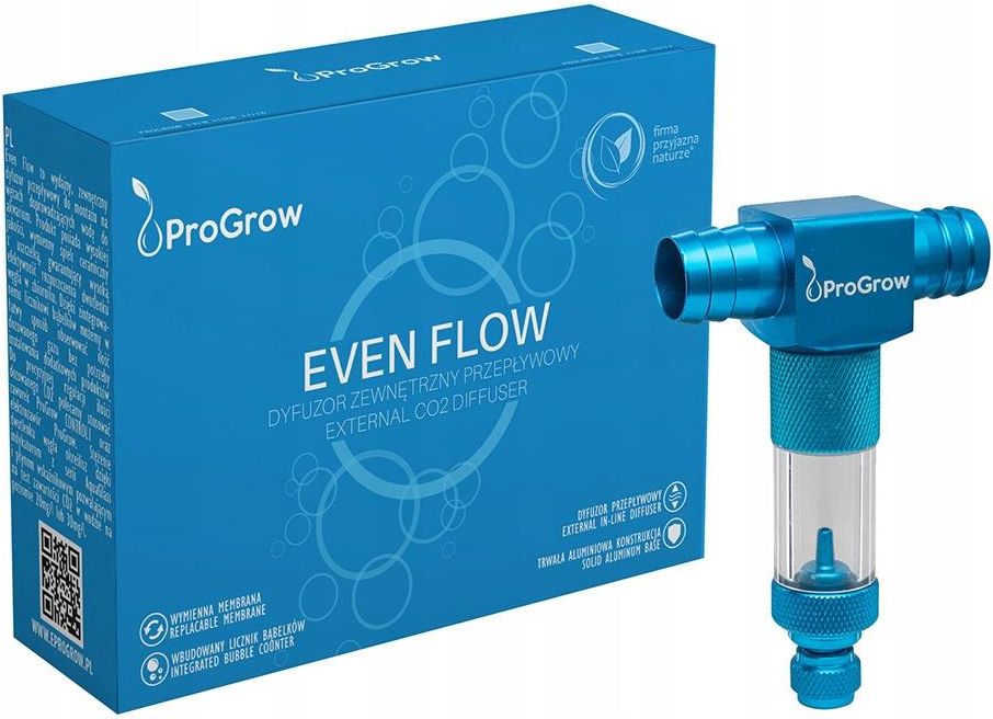 ProGrow Even Flow Dyfuzor zewnętrzny, przepływowy na wąż o średnicy 12/16mm Dyfuzor ProGrow Even Flow to zewnętrzny dyfuzor dwutlenku węgla przeznaczony do współpracy z filtrami kubełkowymi. Dyfuzor umieszcza się na przewodzie doprowadzającym wodę do akwarium i podłącza do zestawu CO2. Dzięki wykorzystaniu pędu wody oraz najwyższej jakości membrany ceramicznej charakteryzuje się on doskonałą rozpuszczalnością dwutlenku węgla. ProGrow Even Flow zawiera zintegrowany licznik bąbelków oraz zaworek przeciw-zwrotny zapobiegający cofaniu się wody z dyfuzora do układu CO2. Nie musisz do niego dokupywać dodatkowych akcesoriów. Wszystko jest gotowe do podłączenia i wydajnej pracy. Produkt posiada unikalną głowicę obracającą się o 360 stopni wokół własnej osi. Dzięki temu montaż urządzenia jest możliwy w różnych pozycjach. Dyfuzor ProGrow Even Flow posiada w komplecie uchwyty mocujące węże z motylkowymi zaciskami pozwalające na szybką i łatwą wymianę membrany (dostępnej jako osobny produkt) lub konserwację dyfuzora. Dzięki ProGrow Even Flow nie musisz martwić się o czyszczenie dyfuzora tak jak ma miejsce to miejsce w przypadku szklanych dyfuzorów. Całość sprzętu możesz umieścić w szafce i cieszyć się doskonałą wydajnością i latami niezawodnej pracy. Zestaw ProGow Even Flow zawiera: dyfuzor zewnętrzny ProGrow Even Flow uchwyty mocujące do węży (2szt.) zintegrowany licznik bąbelków zintegrowany zaworek przeciw-zwrotny Parametry techniczne ProGrow Even Flow 12/16mm: przeznaczony do średnicy węży filtracyjnych 12/16mm złączka dwutlenku węgla na standardowy wężyk 6mm (silikonowy lub PU) lekka aluminiowa konstrukcja nietłukący się zintegrowany licznik bąbelków z tworzywa