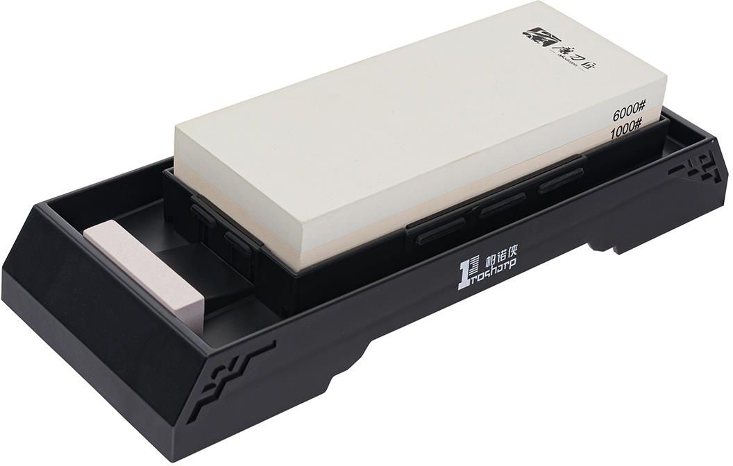 Ostrzałka kamienna Taidea TP8610 Dane techniczne -Wymiary kamienia: 20cm x 8cm x 3,2cm -Gradacja: 1000/6000 Zawartość zestawu - podwójny kamień - Podstawka z możliwością ustawienia kąta ostrzenia - narzędzie do wyrównywania powierzchni kamienia - prowadnica do utrzymania stałego kąta nachylenia noża względem kamienia - gumowa gruszka do polewania kamienia wodą