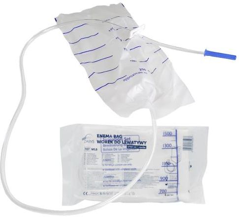 Worek do lewatyw ZARYS, sterylny, poj. 1750 ml 1szt. Opis produktu: Sterylny worek do lewatywy firmy ZARYS wykonany z materiału PCV. Umożliwia wprowadzenie przez odbyt płynu do jelita grubego w celu usunięcia mas kałowych i pobudzenia ruchu perystaltycznego jelit. Dane techniczne: Pojemność worka 1750ml z dwoma otworami do zawieszenia, Skalowany od 50 ml do 1750 ml, Skala linearna co 100 ml cyfrowa co 200 ml, Dren o długości 150 cm z zaciskiem przesuwnym zakończony atraumatycznym otworem i jednym otworem bocznym, Końcówka drenu zabezpieczona zatyczką, Górna część worka wzmocniona dodatkowym kołnierzem stabilizującym wlot podczas wypełniania płynem, Kołnierz wyposażony w zastawkę antyzwrotną,