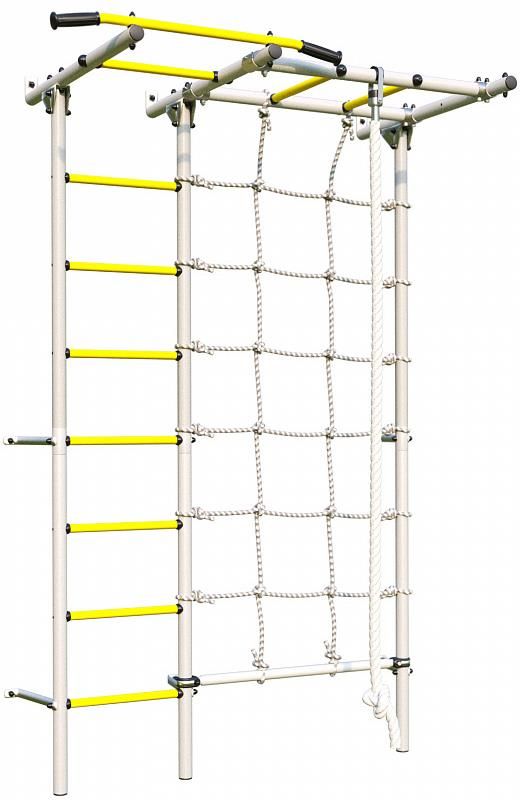 Drabinka ogrodowa dla dzieci ELEMENTY ZESTAWU metalowa drabinka gimnastyczna drabinka pozioma drążek nieprzesuwny lina gimnastyczna słupek z pajęczyną WAZNE Zestaw przeznaczony dla dzieci od 3 lat i dorosłych Dopuszczalne obciążenie drabinki z drążkiem: 100 kg Dopuszczalne obciążenie akcesoriów i siatki: 50 kg Szerokość całkowita zestawu: 154 cm Wymiary: 154 x 86 x 220 cm Szerokość drabinki: 45 cm Wysokość zestawu: 220 cm Montaż: przyścienny Kolorystyka: żółto-srebrny Zalecenia producenta: dzieci od 3 do 7 lat powinny ćwiczyć tylko pod nadzorem rodziców