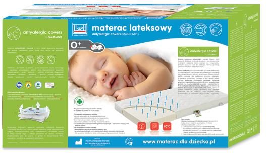 Fiki Miki Materac Lateksowy Antyalergi Covers ML1 120/60/9 cm Box Materac Lateksowy Fiki Miki (Model: ML1) przeznaczony jest do wielokrotnego stosowania u dzieci: w zapobieganiu przeciążeniom kręgosłupa, związanych z wymuszoną pozycją ciała podczas spania, w zapobieganiu wadom postawy, wspomagająco w przeciwdziałaniu zaburzeń snu, w dysfunkcjach narządu ruchu w chorobach układu nerwowo-mięśniowego u dzieci (np. porodowe uszkodzenie splotu ramiennego, mózgowe porażenie dziecięce). Materac Lateksowy antyalergic covers (Model: ML1) charakteryzuje: sprężyste podparcie ciała podczas wypoczynku, doskonała cyrkulacja powietrza, wielowarstwowy pokrowiec antyalergic covers łatwy do utrzymania w czystości, wysoka odporność na zużycie i uszkodzenia. Wypełnienie - czterowarstwowego pokrowca (konstrukcja 4W) wykonanego z dzianiny 100% poliestrowej wykończonej protektorem SANITIZED*), puszystej włókniny poliestrowej i płaskiej włókniny polipropylenowej. - pianki lateksowej (20% lateks naturalny, 80% lateks syntetyczny). Pokrowiec Materac Lateksowy antyalergic covers został wyposażony w pokrowiec, który można bardzo łatwo zdjąć i założyć ponownie. Pokrowiec przystosowany do prania w pralce w temperaturze 60°C, wirowania i suszenia w suszarkach bębnowych.