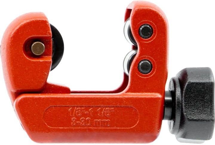 Obcinak do rur miedzianych o śr. 3-30 mm z zapasowym ostrzem Montero Nr katalogowy: E221-0330 EAN: 8422514623018 Producent: Montero Opis produktu: Obcinak do rur miedzianych o śr. 3-30 mm z zapasowym ostrzem w pokrętle Montero E221-0330 Obcinak ręczny przeznaczony do rur miedzianych i innych cienkościennych do średnicy od 3-30 mm. Dzięki małemu promieniowi roboczemy obcinaka można używać w trudno dostępnych miejscach. Łatwa i szybka wymiena kółka tnącego bez potrzeby użycia narzędzi. Obcinak wykonany z metalu malowany na czerwono. Zapasowe koło tnące zamieszczone w ergonomicznym pokrętle. Cechy produktu: zakres: 3 - 30 mm (1/8" - 1 1/8")