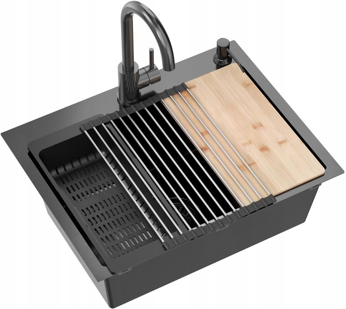 MyQ Zlewozmywak stalowy w zestawie z baterią i akcesoriami Zestaw zawiera zlewozmywak - stalowy Leo Center, bateria - Ganges, syfon - z możliwością podłączenia pralki/zmywarki, dozownik - płynu do naczyń/mydła 320 ml, deska bambusowa, zwijana mata - o wymiarach 38x25, wkładka do zlewozmywaka. Gotowy zestaw prosto do Twojej kuchni! LEO CENTER to wytrzymały stalowy zlew, zaprojektowany do codziennego użytkowania w kuchni, przy zachowaniu kompaktowych wymiarów, które pasują do standardowych szafek o szerokości 60 cm. Wraz z zlewem otrzymujesz bogaty zestaw akcesoriów kuchennych, które znacząco ułatwiają pracę w kuchni. Dzięki najbardziej higienicznej na rynku stali, utrzymanie zlewu w czystości jest łatwe, co zapewnia utrudnienie rozwoju szkodliwych drobnoustrojów. Ten funkcjonalny zlew wykonany ze stali doskonale sprawdzi się w Twojej wymarzonej kuchni! Zlewozmywak stalowy Leo Center Zlewozmywak wykonany ze stali, w nowoczesnym czarnym wykończeniu, to nie tylko elegancki dodatek do Twojej kuchni, ale także praktyczne rozwiązanie. Wyposażony w system odpływu "Save Space", ten zlewozmywak nie tylko oszczędza miejsce, ale także ułatwia utrzymanie czystości i organizację w kuchni. Jego solidna konstrukcja gwarantuje długotrwałą wytrzymałość, a minimalistyczny design dodaje wnętrzu nowoczesnego charakteru. Teraz możesz cieszyć się nie tylko estetyką, ale również funkcjonalnością podczas codziennych czynności kuchennych. Specyfikacja kolor: czarny faktura: stal szczotkowana wymiary: 58 x 45 x 20 cm wymiar otworuw blacie: zlewozmywak kładziemy do góry nogami na blacie, odrysowujemy obwód ołówkiem i odejmujemy po 1-1,5 cm z KAŻDEJ strony - na mailową prośbę, możemy wysłać szablon w PDF do własnego wydruku w drukarni komoraowymiarze: 35 x 53 minimalna szerokość szafki, w której może być zamontowany zlewozmywak oraz syfon: 60 cm odpływ: save space Bateria kuchenna Ganges Bateria Ganges to perfekcyjne połączenie stylu i funkcjonalności. W eleganckim czarnym kolorze, stojąca i jednouchwytowa konstrukcja zapewnia łatwą obsługę i precyzyjną kontrolę nad przepływem wody. Wykonana ze stali szlachetnej, zapewnia trwałość i odporność na korozję. Dodatkowo, posiada atest PZH, co potwierdza jej wysoką jakość i bezpieczeństwo użytkowania. Bateria kuchenna Ganges to nie tylko estetyczny element wyposażenia kuchni, ale także gwarancja wyjątkowej wygody i niezawodności. Specyfikacja kolor: czarny PVD typ: stojąca, jednouchwytowa kształt: U materiał: stal szlachetna głowica: ceramiczna (zmniejsza możliwość powstawania kamiennych osadów i zanieczyszczeń) wylewka: obrotowa 360° wysokość: 32 cm funkcja prysznica: nie mocowanie: QFix w komplecie: 2 wężyki przyłączeniowe G3/8 cali o długości 40cm, instrukcja z gwarancją Produkt posiada atest PZH Zestaw nie tylko zawiera wysokiej jakości zlewozmywak i baterię, ale także dodatkowe elementy, które sprawią, że Twoja kuchnia będzie jeszcze bardziej funkcjonalna i estetyczna. Dozownik płynu do naczyń pozwoli Ci utrzymać porządek w kuchni w łatwy i wygodny sposób, a bambusowa deska i zwijana mata zapewnią wygodne miejsce do przygotowywania potraw oraz ochronią powierzchnię blatu. Dodatkowo, wkładka do zlewozmywaka ułatwi Ci utrzymanie zlewu w czystości i zapobiegnie zatykaniu rur. Ten kompleksowy zestaw spełni wszystkie Twoje potrzeby kuchenne, zapewniając zarówno praktyczne rozwiązania, jak i estetyczny wygląd. myQ to firma, w której armatura kuchenna stanowią naszą pasję. Z ogromną wiedzą na temat tych produktów pragniemy dzielić się z naszymi klientami, oferując im przemyślane, niezawodne oraz estetycznie i proste rozwiązania. Nasza oferta obejmuje zarówno zlewozmywaki z konglomeratów, jak i wykonane ze stali, wraz z dopasowanymi do nich bateriami kuchennymi oraz akcesoriami. Naszym priorytetem jest zapewnienie klientom poczucia bezpieczeństwa i wygody. Korzystając z naszej oferty, kupujesz produkty najwyższej jakości! Zapraszamy do zapoznania się z innymi produktami marki myQ na naszych pozostałych aukcjach!