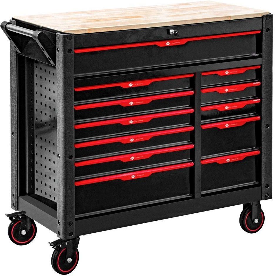 Profesjonalny wózek narzędziowy 360 elementów 12 szuflad Potrzebujesz solidnego i odpornego wyposażenia warsztatowego o wysokiej funkcjonalności? Zależy Ci na gotowym rozwiązaniu, które nie będzie wymagało od Ciebie żadnych dodatkowych inwestycji? Profesjonalny wózek narzędziowy to niezbędne wyposażenie każdego warsztatu, serwisu czy garażu. Zapewnia wygodną organizację narzędzi, umożliwiając szybki dostęp do niezbędnych przyrządów podczas pracy. Solidna konstrukcja, przemyślane rozwiązania ergonomiczne oraz duża pojemność sprawiają, że wózek narzędziowy to idealne rozwiązanie zarówno dla profesjonalistów, jak i majsterkowiczów, którzy cenią porządek, funkcjonalność i mobilność. Wózek warsztatowy dla najbardziej wymagających Profesjonalny wózek narzędziowy Airpress to kompleksowe rozwiązanie dla warsztatów i serwisów. Wyposażony w 12 szuflad z indywidualnymi blokadami oraz 360 narzędzi w 11 modułach, zapewnia porządek i wygodę pracy. Drewniany blat zwiększa wytrzymałość, umożliwiając użycie wózka jako mobilnego stołu roboczego. Centralny zamek, amortyzowane narożniki i wzmocnione prowadnice kulowe gwarantują bezpieczeństwo i trwałość. Skrętne koła z hamulcami zapewniają mobilność i stabilność. To niezawodne wyposażenie dla wymagających profesjonalistów. Oto model, który spełni wszystkie Twoje oczekiwania! Wytrzymałość, bezpieczeństwo i funkcjonalność w jednym W przeciwieństwie do większości naszych modeli warsztatowych, wózek narzędziowy 79619 wyposażyliśmy w solidny blat wykonany z wysokiej jakości, twardego drewna. Zastosowanie drewnianego blatu pozwoliło nam zwiększyć trwałość i wytrzymałość wózka, a także podnieść jego wartość użytkową. Wózek warsztatowy w takiej konstrukcji może być również wykorzystywany jako mobilny stół warsztatowy. Narożniki wózka zostały zabezpieczone miękkim tworzywem amortyzującym, co dodatkowo zwiększa jego wytrzymałość oraz odporność na uszkodzenia mechaniczne, na które sprzęt warsztatowy narażony jest w sposób szczególny. Wzmocniony uchwyt transportowy zapewnia wygodne i bezpieczne manewrowanie wózkiem pod pełnym obciążeniem, gwarantując Ci pełne bezpieczeństwo pracy. Bezpieczeństwo i pełna kontrola przechowywania Górna szuflada wyposażona została w zamek centralny, co zapewnia bezpieczne przechowywanie wartościowych przedmiotów, takich jak klucze czy dokumenty. Każda szuflada posiada indywidualną blokadę, która zapobiega ich przypadkowemu otwarciu, nawet podczas przemieszczania wózka po nierównym terenie. Solidna konstrukcja znacznie zwiększa mobilność wózka, pozwalając na swobodne i bezpieczne transportowanie narzędzi w każde miejsce pracy. Wszystkie szuflady zostały osadzone na wzmocnionych prowadnicach kulowych, co zapewnia ich płynną pracę nawet pod dużym obciążeniem. Pełna mobilność i stabilna praca Wózek jest wyposażony w 4 wzmocnione koła skrętne, co zapewni Ci pełną swobodę manewrowania sprzętem, stosownie do potrzeb. Dwa koła posiadają solidne hamulce, dzięki czemu wózek narzędziowy 79619 z jednej strony jest maksymalnie mobilnym wyposażeniem warsztatowym, z drugiej zaś - pozostaje stabilnym miejscem pracy w trybie stacjonarnym. Dzięki wszystkim swoim funkcjonalnościom, wózek narzędziowy Airpress stanowi praktyczne i niezawodne wyposażenie każdego warsztatu! 11 modułów narzędziowych - wszechstronne wyposażenie na każdą okazję! Wózek narzędziowy 79619 został wyposażony w aż 11 zestawów narzędzi w formie praktycznych modułów. Wszystkie narzędzia wchodzące w skład wyposażenia wykonano z wysokiej jakości materiałów - w znacznej większości ze stali chromowo-wanadowej, częściowo zaś ze stali węglowej. Dzięki temu narzędzia są doskonale przystosowane do pracy w ciężkich warunkach warsztatowych i wyróżniają się ponadprzeciętną żywotnością. Wszystkie narzędzia umieszczone są w specjalnych wkładach piankowych, pokrytych olejoodporną warstwą z poliwęglanu. Moduły narzędziowe są łatwe w czyszczeniu i wyjątkowo wytrzymałe, bez względu na warunki pracy, w jakich przyjdzie Ci pracować! Przy każdym elemencie modułu znajdują się dodatkowe oznaczenia, które pozwolą Ci szybko i sprawnie znaleźć odpowiedni przyrząd, a także ułatwią utrzymanie porządku na stanowisku pracy. Optymalne rozmiary dla wygody i pojemności Pełne wymiary wózka: 108.6 x 51 x 87 cm Wysokość kół: 14/15 cm Wymiary blatu: 103.5 x 46 x 2 cm Górna szuflada: 92.5 x 41.5 x 11 cm Środkowe szuflady duże: 58 x 41.5 x 6.5 cm Środkowe szuflady małe: 31.5 x 41.5 x 6.5 cm Dolna szuflada duża: 58 x 41.5 cm x 14.5 cm Dolna szuflada mała: 31.5 x 41.5 x 14.5 cm Dolne, głębokie szuflady bez wyposażenia możesz wykorzystać do przechowywania większych narzędzi akumulatorowych, elektrycznych lub pneumatycznych, dzięki czemu możesz mieć pełen wachlarz narzędzi zawsze pod ręką! Zestaw kluczy z kompletem nasadek (186 elementów) 3 pokrętła z grzechotką (72 zęby) - 1/4", 3/8", 1/2" klucz dynamometryczny 1/2" 20-210 Nm (72 zęby) wkrętak 1/4" do nasadek i bitów 9 kluczy sześciokątnych - 1.5-2-2.5-3-4-5-6-8-10mm 9 kluczy TORX - T10-15-20-25-27-30-40-45-50 48 bitów z nasadką 1/4" - SL4-5.5-6.5-7; PH0-1-2-3; PZ0-1-2-3; T8-9-10-15-20-25-27-30-40; TT8-9-10-15-20-25-27-30-40; TTS10-15-20-25-27-30-40-45-50; M8-10-12; H3-4-5-6-7-8 13 nasadek 1/4" - 4-4.5-5-5.5-6-7-8-9-10-11-12-13-14mm 24 bity 8mm - SL8-10-12; PH3-4; PZ3-4; T40-45-50-55-60-70; H7-8-10-12-14; TT40-45-50-55-60-70 17 nasadek 3/8" - 6-7-8-9-10-11-12-13-14-15-16-17-18-19-20-21-22mm 7 nasadek TORX-E (gwiazdkowe) 3/8" - E10-11-12-14-16-18-20 2 nasadki do świec zapłonowych 3/8" - 16mm, 21mm przegub 3/8" 18 bitów z nasadką 1/2" - H14-H17-H19-M18*55L; R9-M9*100L; M16*100L; T80*100L; T40-T45-T50-T55-T60-T70*140L; R10*140L; M10-M12-M14*140L 17 nasadek 1/2" - 10-11-12-13-14