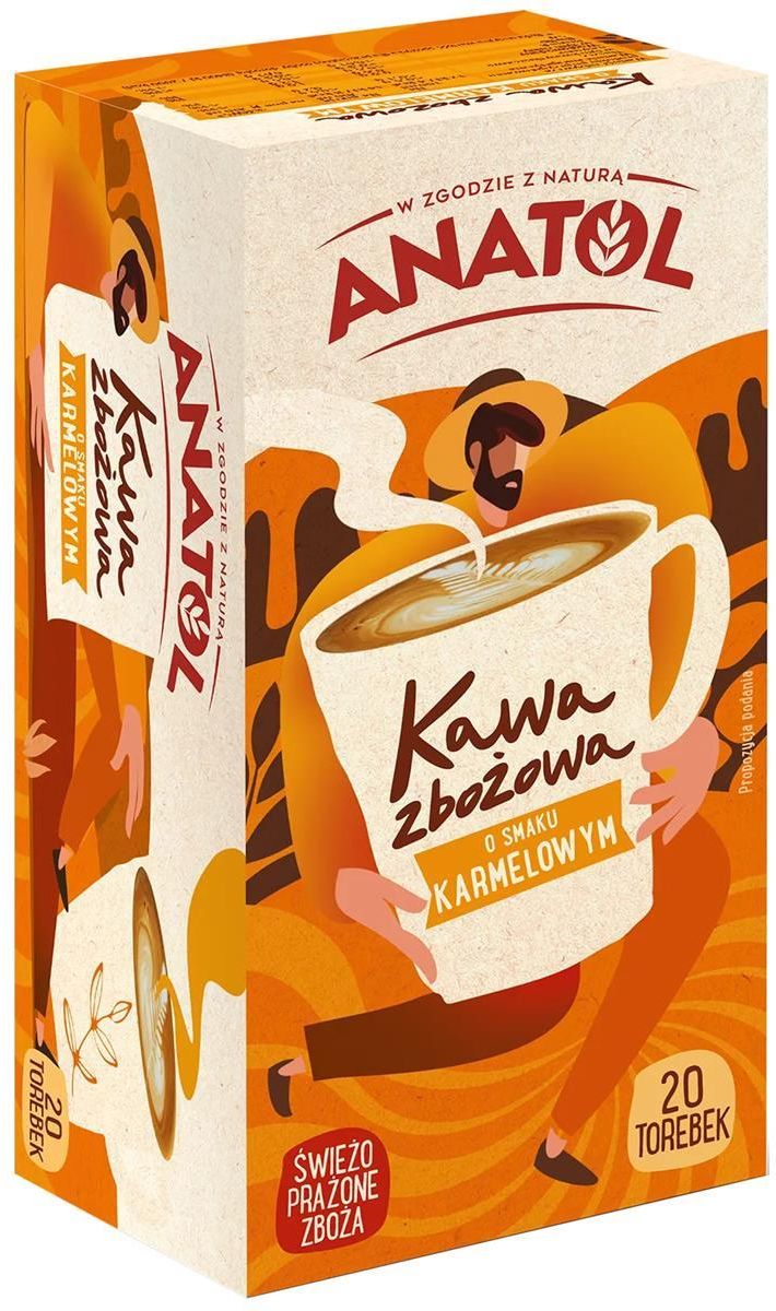 Anatol, kawa zbożowa o smaku karmelowym – napój o bogatym, pełnym smaku i wyjątkowym aromacie z subtelną, słodką nutą karmelu. Nie zawiera kofeiny, dlatego idealnie sprawdzi się jako ciepły napój dla dorosłych i dzieci – najlepiej smakuje z mlekiem lub śmietanką.