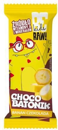 BeRaw! Kids, Choco Batonik, banan czekolada – bananowy batonik dla dzieci oblany mleczną czekoladą, został wzbogacony o witaminę A, magnez, cynk i selen. Dzięki zawartości owoców, syropu owsianego i chrupiących dodatków stanowi idealną alternatywę dla klasycznych słodyczy. Gotowy do spożycia o każdej porze – w szkole, na spacerze lub po treningu.