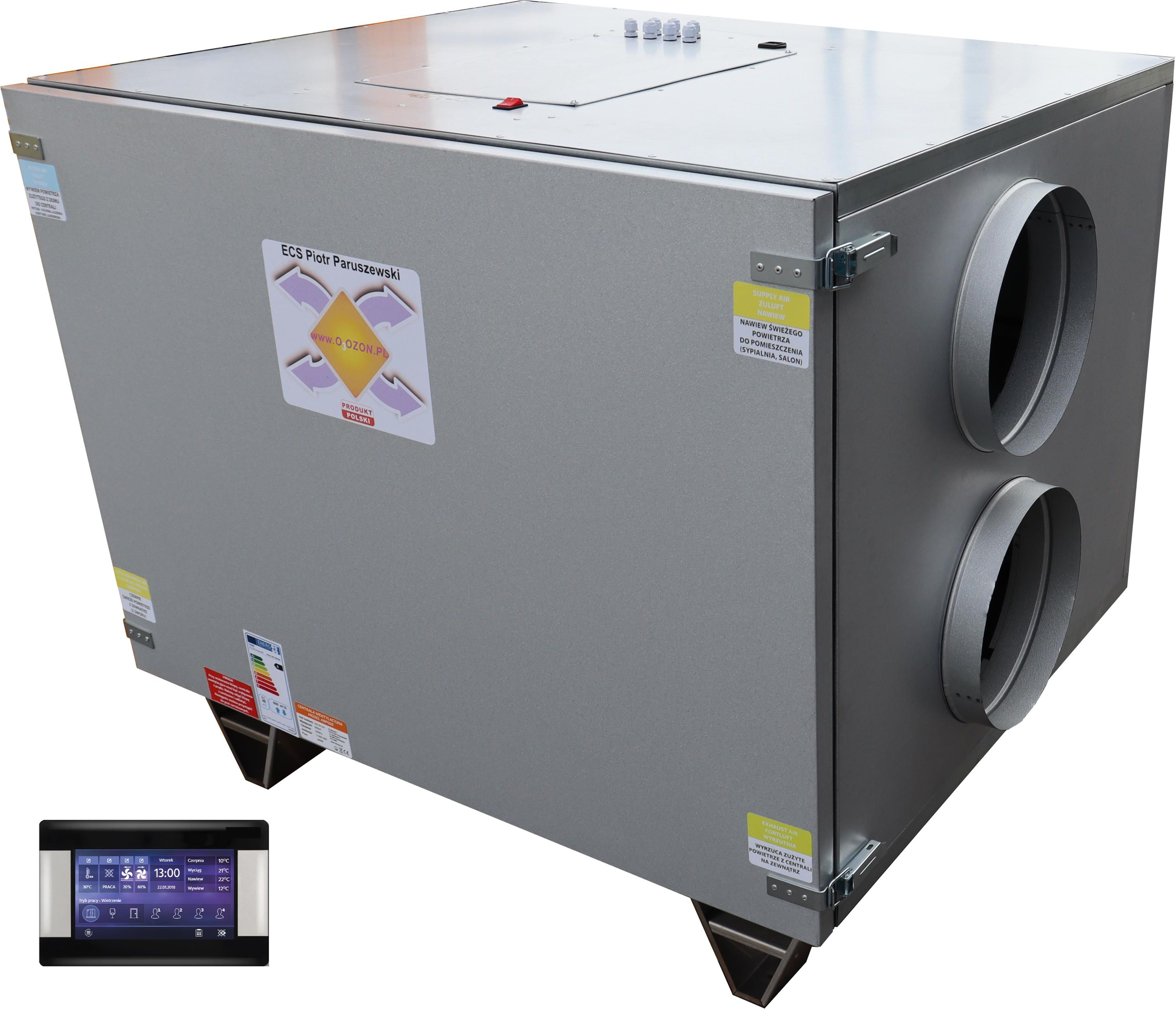 Centrala wentylacyjna rekuperator + sterownik ABP- 1200/315 jon16 Centrala ABP-1200 spełnia wymagania WFOŚiGW dotyczące programu Czyste Powietrze. Wbudowany jonizator jonów ujemnych Jon ujemny pomaga: Zabijać bakterie, wirusy i grzyby Ułatwia oddychanie Oczyszczać i odświeżać powietrze Przyśpieszać odpoczynek Wzmaga koncentrację Pomaga w nauce Polepsza kondycję Zawiera WENTYLATOR "EC" NIEMIECKIEJ FIRMY WBUDOWANY JONIZATOR ŚREDNICA KRÓĆCA 315 mm OBROTY MAX 2400 obr/min FILTRY KLASY G4 REKUPERATOR PRZECIWPRĄDOWY WYCIĄGANY ŁATWY DO UMYCIA SPRAWNOŚĆ REKUPERATORA OD 65% do 92% (parametr zależy od różnicy temp.przepływu ) MOC URZĄDZENIA OD 80 DO 580W WBUDOWANY SYSTEM OCZYSZCZACZ POWIETRZA (MIKRO CZĄSTEK) SYSTEM ANTYELEKTROSTATYCZNY SYSTEM INFORMACJI O ZABRUDZONYM FILTRZE BY-PASS 100% nawet renomowana konkurencja ma z tym problem !!! OBUDOWĘ WYKONANĄ Z BLACHY 0,7 mm ALUM-CYNK GRUBOŚĆ IZOLACJI 30 mm=3cm IZOLACJA AKUSTYCZNA IZOLACJA CIEPLNA KOMINKOWA ODPORNA NA WYSOKIE TEMP. Z PŁASZCZEM ALUMINIOWYM ODPŁYW SKROPLONEJ WODY !!! BARDZO DOBRY STOSUNEK CENY DO JAKOŚCI PANEL DOTYKOWY PRODUKT POLSKI Firma ECS posiada ponad 16 letnie doświadczenie w produkcji urządzeń dla przemysłu, produkuje dla największych firm renomowanych , międzynarodowych. Każdy model centrali wentylacyjnej powstaje w oparciu o przemyślane rozwiązania i sprawdzoną technologię. Filtr- wkład wykonany jako włóknina klasy G4 Nie musisz kupować drogich filtrów !!!. Można łączyć kilka filtrów np G4+F9+H14 ps smog zostanie zniwelowany w 80-90% Zastosowano wentylatory "EC" PRODUKCJI MADE IN GERMANY Zastosowanie większych wentylatorów zwiększa ich żywotność, oraz wygłusza system wentylacji Obudowa Obudowa wykonana jest z cienkich blach alum cynk obustronnie ocynkowanych, które są specjalnie kształtowane na obrabiarkach numerycznych i montowane na stałe przy pomocy nitów ocynkowanych tworząc sztywną samonośną konstrukcję. Materiał alum cynk zapewnia to doskonałą ochronę powierzchni które mają kontakt z powietrzem wentylacyjnym oraz uszczelnia wszystkie elementy obudowy. Pod względem akustycznym i termicznym, obudowa zabezpieczona jest 30 milimetrową warstwą wełny. Zadaniem jonizatora jest naturalne oczyszczenie powietrza z nieczystości, takich jak: , roztocza, bakterie beztlenowe, kurz dym papierosowy, pyłek kwiatowy itp. BY-PASS 100% WYKONANY NA SIŁOWNIKU SZWAJCARSKIEJ FIRMY GWARANTUJĄCEJ NIEZAWODNOŚĆ Filtr Włóknina G4 (wywiew i nawiew) Bardzo tani filtr możliwość wymiany samej włókniny koszt 2-4 zł Możliwość konfiguracji dowolnej filtra od G1 do U15 (filtry stosowane na sali operacyjnej) Możliwość łączenia kilku filtrów jednocześnie Praca przemysłowa Sterowanie Możliwość sterowania w obiektach o Inteligentnych instalacjach Możliwość dopasowania optymalnych parametrów pracy wentylatora Specyfikacja WYDAJNOŚĆ MAX 1200m3/h MOC min 80W max 580W Ciśnienie do 700Pa NAPIĘCIE 230 V 50 Hz Sprawność odzysku ciepła od 75% do 92% Obroty silnika 2400 obr/min Poziom hałasu db/(A)3m 24-52 Maksymalna temp pracy do 45C Materiał obudowy blacha alumcynk 0,7mm Wełna 30mm Filtr nawiew G4 Filtr wyciąg G4 Średnica króćców 315 mm Sprawność rekuperatora do max 92% Rekuperator PRZECIWPRĄDOWY Rekuperator TWORZYWO System sygnalizacji zabrudzonego filtra Ba-pass System antyzamrożeniowy Waga około 120 kg JAKOŚĆ MUSI WAŻYĆ PORÓWNAJ Z INNYMI PRODUKTAMI TEJ KLASY Wymiary 1180x990x840 mm PANEL DOTYKOWY Sterownik umożliwia: pomiar temperatur regulacje siły nawiewu sterowanie by-pass ustawianie harmonogramu sterowanie nagrzewnicą załączanie sterowania GWC konfiguracja sterowania chłodnicą wtórną załączenie nagrzewnicy wstępnej sygnalizacja zabrudzonego filtra integracja z systemem BMS, dzięki protokołowi komunikacyjnemu Modbus RTU. możliwość monitoringu jakości powietrza - temperatura, wilgotność, stężenie gazów. do wyboru j. polski, angielski rosyjski aktualizacja oprogramowania poprzez kartę SD. Kompleksowa regulacja stopnia wykorzystania odzysku ciepła itd...... Sercem sterownika jest mikroprocesor o dużej mocy obliczeniowej, w którym zastosowane jest innowacyjne oprogramowanie. System sterowania jest również kompatybilny z aplikacją umożliwiającą zdalne sterowanie urządzeniem przy pomocy komputera lub urządzenia przenośnego. Sterownik zamontowany w centrali posiada funkcje: • odzysku ciepła z wentylowanych pomieszczeń poprzez sterowanie rekuperatorem mechanicznej wentylacji z wymiennikiem przeciwprądowym, krzyżowym lub obrotowym • płynnie sterują pracą wentylatorów nawiewu i wywiewu zapewniając wysoką sprawność odzysku ciepła oraz wymianę powietrza w pomieszczeniach w oparciu o zaprogramowane harmonogramy lub w sterowaniu ręcznym • sterują nagrzewnicami (elektryczną lub wodną) oraz chłodnicą (freonową lub wodną) w sposób płynny, zapewniając wysoki komfort oraz precyzję regulacji wentylowanego powietrza • sterują bypassem oraz gruntowym wymiennikiem ciepła • potrójnej ochrony wymiennika przez zamarznięciem • współpracują z modułem internetowym ecoNET300 i aplikacją mobilną ecoNET.apk i ecoNET.app • współpracują z dodatkowymi panelami pokojowymi • sygnalizacją konieczności wymiany filtrów • sygnalizują oraz zapisują stany alarmowe zapewniając odpowiednią reakcję systemu • zapisują łączny czas pracy poszczególnych komponentów w licznikach oraz liczy sprawność pracy rekuperatora • umożliwiają komunikację poprzez protokół Modbus RTU, którym można sterować lub monitorować działanie całego urządzenia z zewnętrznego systemu zarządzania budynkiem • swobodna konfiguracja przeznaczenia wejść/wyjść rekuperatora umożliwia dostosowanie działania sterownika w zależności od zapotrzebowania Dodatkowy moduł internetowy umożliwia Moduł internetowy ecoNET umożliwia zdalny dostęp do regulatora za pośrednictwem komp