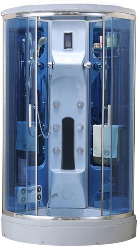 Kabina prysznicowa z hydromasażem , chrom Wymiary zewnętrzne: 100 x 100 x 220 cm Typ brodzika: niski brodzik Wysokość brodzika (zewnątrz): 21 cm Grubość szkła hartowanego: 5 mm Materiał wykonania: – Brodzika: Akryl (ABS – kolor biały) – Ramy: aluminium (srebrny) – Ścian tylnych: szyby (błękitne – szyby lustrzane) Wyposażenie: – Dysze do hydromasażu (2″): 6 szt. – Bateria prysznicowa: tak (zawór mieszający, rozdzielacz) – Pokrętła pokryte chromem: tak – Wielofunkcyjny prysznic ręczny: 1 szt. (regulowany: góra/dół) – Deszczownica: 1 szt. – Wentylator wyciągowy: 1 szt. – Półka na kosmetyki: 1 szt. – Uchwyt pałąkowy: 1 szt. – Siedzisko z oparciem: 1 szt. – Masażer do stóp: 1 szt. – Światło (zamontowane w dachu): 1 szt. (1 kolor – biały) – Panel sterowania: tak – Radio: 1 szt. – Głośnik: 1 szt. – Jonizator: 1 szt. Dno brodzika antypoślizgowe Typ kabiny: narożna Typ drzwi: podwójne przesuwne Węże przyłączeniowe do wody: tak (1/2″) Elementy montażowe: tak