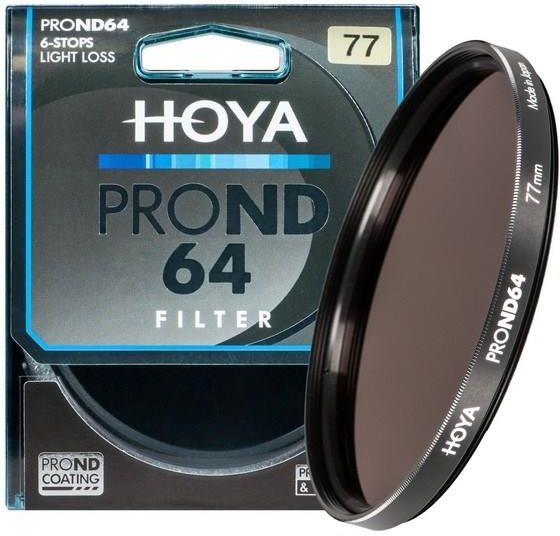 PRO ND64     Filtry z serii PROND to obecnie najbardziej zaawansowane technologicznie filtry szare dostępne na rynku. Do ich produkcji wykorzystano nowatorską metodę polegającą na obustronnym pokryciu filtra powłoką antyrefleksyjną ACCU-ND. Gwarantuje to, że rejestrowany obraz wiernie zachowuje kolorystykę. Filtry przeznaczone są nie tylko dla fotografów – doskonale sprawdzą się też na rynku video HDSLR. Filtr Hoya PROND 64 redukuje ilość światła docierającego do matrycy o 6 działek przysłony.   Wysoka jakość szkła optycznego filtrów serii PROND w połączeniu z technologią ACCU-ND zapewnia wyjątkowy komfort użytkownikom – zarówno fotografom, jak i operatorom kamery video. Podczas rejestracji zdjęć w dynamicznie zmieniających się warunkach oświetleniowych, wymagających zastosowania filtrów o różnym stopniu przepuszczalności, nie trzeba korygować balansu bieli w aparacie ani stosować dodatkowej obróbki cyfrowej zdjęć i filmów, by skorygować barwy obrazu, co często zdarza się przy użyciu tańszych filtrów szarych innej produkcji.   Filtry serii PROND posiadają wiele zastosowań. Pozwalają wydłużyć czas ekspozycji, gdy nie jest możliwe mocniejsze przymknięcie przysłony lub zmniejszenie czułości ISO. W słoneczny dzień umożliwiają uzyskanie małej głębi ostrości przy użyciu jasnych obiektywów, co ma szczególne znaczenie w fotografii portretowej i w filmie. Ułatwiają także dopasowanie ekspozycji w kamerach filmowych, w których czas naświetlania nie może być swobodnie regulowany. Pozwalają w ciekawy sposób uchwycić ruch na zdjęciu, świetnie nadając się do fotografowania wodospadów oraz innych naturalnych scenerii. Filtry serii PROND posiadają cienką aluminiową oprawkę typu Low Profile Frame. Pozwala to uniknąć zjawiska winietowania. Filtry mogą współpracować nawet z obiektywami super szerokokątnymi.