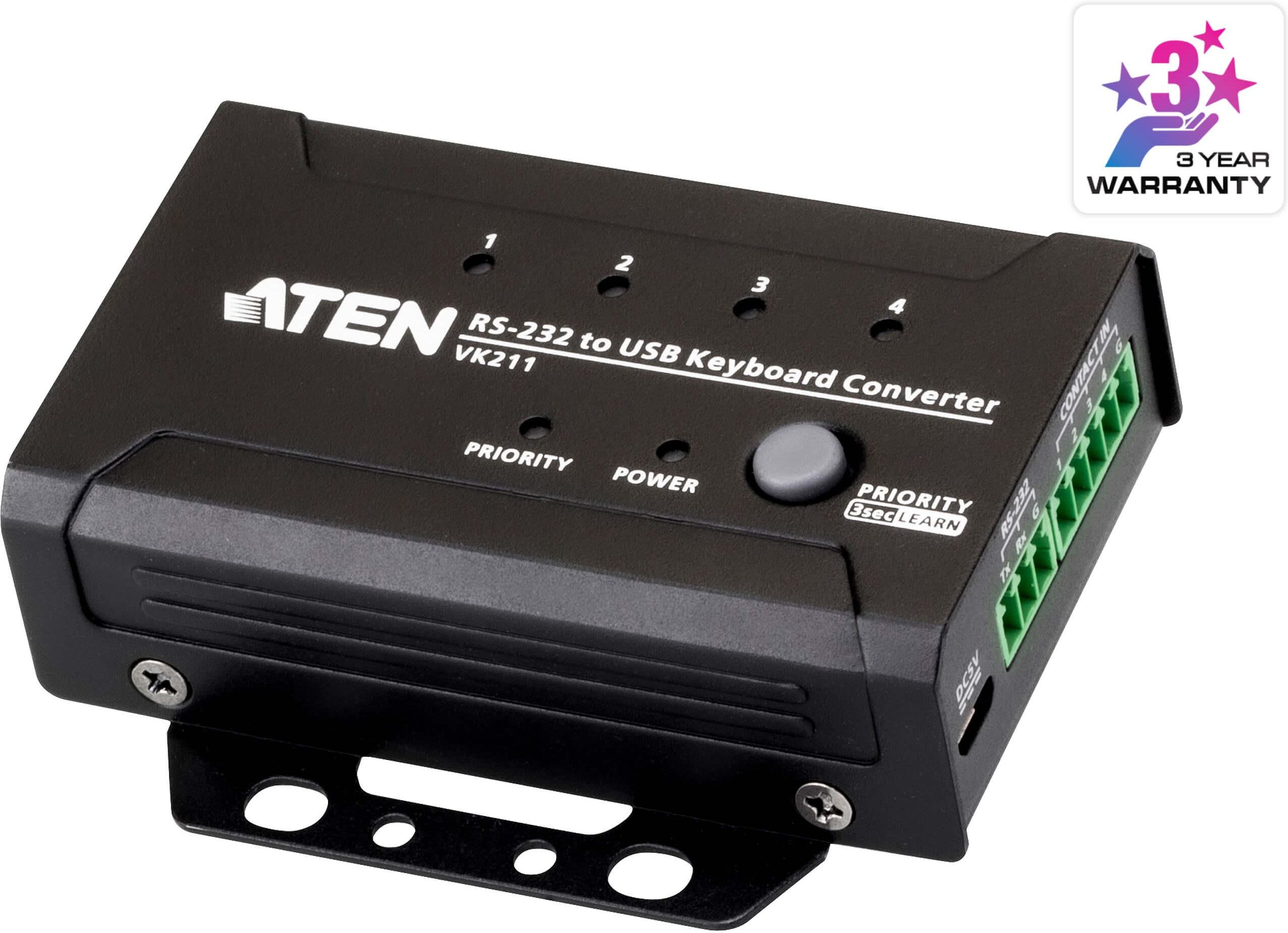 VK211 konwertuje polecenia RS-232 na pełnozakresowe sygnały klawiatury USB do zdalnego sterowania za pomocą urządzeń wykorzystujących klawiaturę USB, takich jak KVM i komputery PC, rozszerzając zastosowania systemu sterowania ATEN / kontrolerów innych firm. Ponadto VK211 może odtwarzać zapisane kody klawiszy i przechowywać do 4 zaprogramowanych akcji wyzwalanych przez sygnały Contact In. Funkcja Learn przechwytuje sygnały z klawiatury USB po naciśnięciu określonych kombinacji klawiszy, aby ułatwić procedurę konfiguracji. Łatwy do zauważenia przycisk kontroli priorytetu na panelu umożliwia lokalnym operatorom zarządzanie zdalnym dostępem, zapewnienie dokładności działania i radzenie sobie w sytuacjach awaryjnych. Wbudowane diody LED na pierwszy rzut oka wskazują stan cyfrowych sygnałów wejściowych, priorytet sterowania i zasilanie. Dzięki możliwości emulowania sygnałów klawiatury USB, VK211 jest idealny do zapewnienia interfejsów RS-232 / Contact In dla KVM lub dowolnych urządzeń opartych na PC bez funkcji zdalnego sterowania. Kompaktowy rozmiar i konstrukcja niewymagająca źródła zasilania są odpowiednie do zastosowań takich jak linie produkcyjne w fabrykach, sterownie lub wszelkie obiekty wymagające automatyzacji z systemem sterowania i zdalnej bezpiecznej obsługi bez konieczności instalowania oprogramowania. Konwertuje polecenia RS-232 na pełnozakresowe sygnały klawiatury USB do zdalnego sterowania za pomocą urządzeń wyorzystujących klawiatury USB, takich jak KVM i komputery PC Odtwarza zapisane kody kluczy i umożliwia przechowywanie do 4 zaprogramowanych działań wyzwalanych przez sygnały ze złącza Contact In Lokalne porty konsoli USB do podłączenia klawiatury/myszy Przycisk kontroli priorytetu na panelu dla lokalnych operatorów do zarządzania zdalnym dostępem w sytuacjach awaryjnych Diody LED na pierwszy rzut oka wskazują stan cyfrowych sygnałów wejściowych, kontrolę priorytetu i zasilanie Połączenie z urządzeniami USB nie wymaga dodatkowego zasilania Tryb nauki ułatwia procedurę konfiguracji i konfiguracji