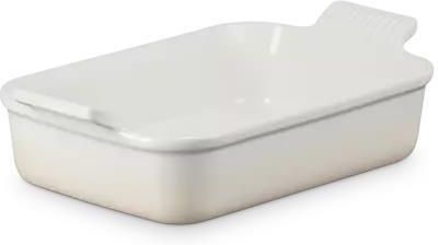 Le Creuset - Prostokątne naczynie do zapiekania 26x19cm 2,4l meringue. Ta forma do zapiekania z kamionki to prawdziwy niezbędnik w kuchni. Jej prostokątny kształt świetnie sprawdzi się do różnego rodzaju składników, co czyni ją idealną do zapiekania, pieczenia, marynowania oraz serwowania. Wygodne uchwyty muszelkowe zapewniają bezpieczne i łatwe przenoszenie, a dzięki wysokim ściankom naczynie jest bardzo pojemne.