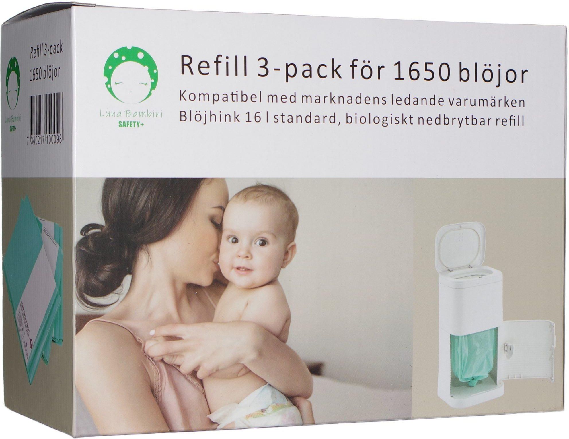 Refill - Wkłady do kosza na pieluszki 16 L, 3 sztuki. Pomieszczą 1650 pieluch. Lekko pachną, powstrzymują wydobywanie się zapachów z kosza. Mocne i biodegradowalne. Właściwości wkładów: Wykonane z wytrzymałego polietylenu o wysokiej gęstości, który nie pozwala na wydostanie się zapachów ani płynów na zewnątrz Worek/refill ulega biodegradacji w czasie od 9 miesięcy do 5 lat