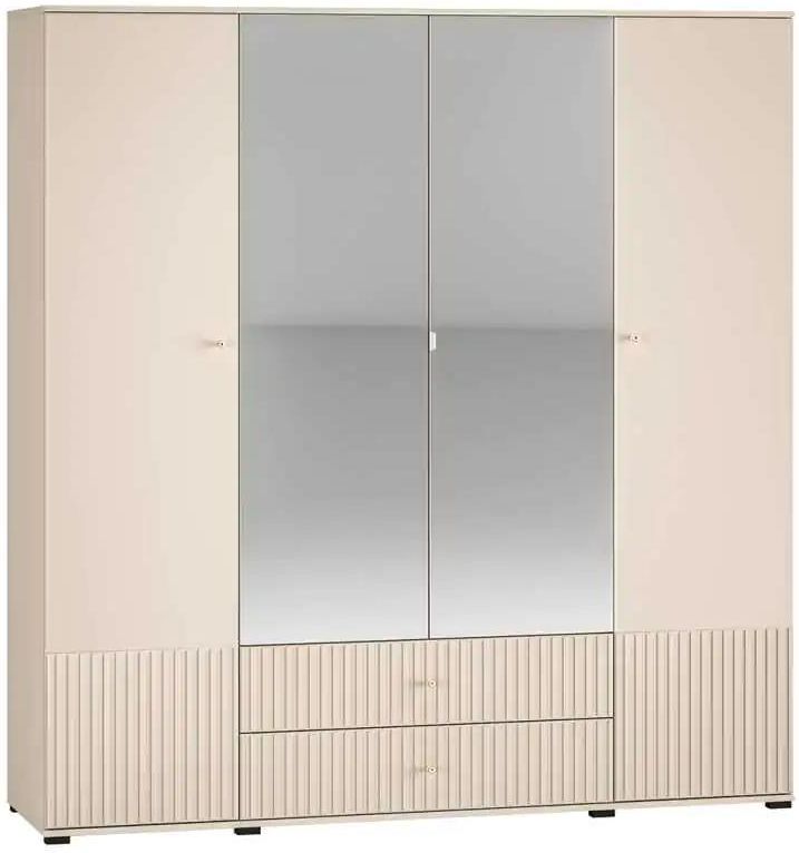 Szafa z lustrami SOPHIE 23 firmy MLMEBLE Pojemna, elegancka szafa czterodrzwiowa, świetnie sprawdzi się w sypialni czy przedpokoju. Za niższymi lustrzanymi frontami ukryty został drążek na ubrania oraz półka. Pod nimi znajdują się dwie pojemne szuflady. Po prawej i lewej stronie szafy znajduję się …