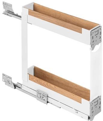 Pinello Spice Liro z drewnem 150/ 2/ białe wąskie cargo dwu-półkowe do małych przestrzeni wokół zlewu i kuchenki Pinello Liro Spice 150 cargo z dwoma półkami w kolorze białym, wykończonymi dębowymi listewkami to idealne rozwiązanie dla osób poszukujących wysuwanych i funkcjonalnych rozwiązań do małych szafek kuchennych. To wąskie cargo z dwoma półkami doskonale sprawdza się w wykorzystaniu nawet najmniejszych, pozornie nieużytecznych miejsc wokół zlewu. Montowane zarówno po lewej, jak i prawej stronie, jest wygodne w obsłudze dzięki ukrytym prowadnicom umieszczonym pod półkami, co gwarantuje estetykę w szafkach kuchennych. System dedykowany jest do frontów z uchwytami, ale można go również zamontować w szafkach bezuchwytowych, po dokupieniu mechanizmu push to open. Prowadnice zapewniają pełen wysuw, a mechanizm Softclose gwarantuje płynne i ciche zamykanie, co wpływa na komfort codziennego użytkowania.Białe półki Pinello Liro wyróżniają się minimalistycznym, nowoczesnym designem, idealnym do jasnych, przestronnych kuchni. Wykonane z najwyższej jakości powlekanej blachy stalowej, są łatwe w czyszczeniu, a dodatkowe silikonowe maty chronią dno półek. Pinello Liro Spice 150 w kolorze białym to idealne rozwiązanie do kuchni, gdzie styl i funkcjonalność muszą iść w parze. Parametry techniczne Marka / Producent Producent PEKA Wykończenie Materiał mechanizm: stalmaty: tworzywo sztucznereling: barierka drewniana Powierzchnia malowana proszkowo Kolor biały Linia koszy Liro z drewnem Model Spice Wymiary Wysokość światła szafki min. 525 mm Szerokość światła szafki 112 - 118 mm Głębokość światła szafki min. 506 mm Szerokość kosza 95 mm Szerokość drzwi 150 mm Obciążenie Obciążenie całego systemu 30 kg Obciążenie na półkę 10 kg Rodzaje mocowań Śruby montażowe brak (do dokupienia) Sposób montażu Montaż w szafce podblatowejdo korpusu i frontu Sposób mocowania za pomocą wkrętówzalecane przez producenta Ø4 x 16 mm Ø7,5 x 14 mm szczegóły w inst. montażu Składniki zestawu Elementy zestawu 1 x mechanizm (rama z koszami)2 x maty silikonowe4 x listewki dębowe1 x prowadnice Nova Pro L500 mm2 x mocowania frontu3 x zestawy podkładek Hamulec zintegrowany Softclose(płynne i ciche zamykanie) Opakowanie Ilość paczek 1 Waga opakowania 8 kg Wymiary opakowania 120 x 510 x 510 mm