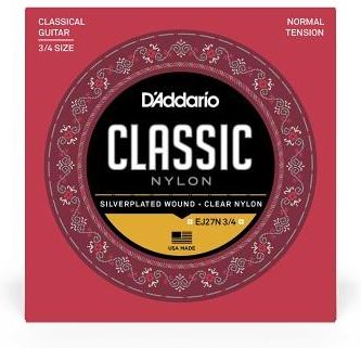 D’Addario Classic Nylon Student strings are designed specifically for beginner classical guitarists. The traditional combination of silver-plated copper wound over nylon and clear nylon trebles, brings a charmingly mellow balance, which strikes a chord with students. Classic Nylon sets are also available in smaller sizes to accommodate learner instruments. This Normal Tension 3/4 size set features our best-selling tension, made to fit 3/4 size student guitars. D'Addario's EJ27 Classic Nylon guitar strings are great for beginners, students and professionals alike. Each set contains 3 clear nylon trebles and 3 silver-plated copper wound basses for the optimal balance of warm and projecting, long lasting tone. Each set is held to same high standards as our professional string sets and may be used for all players looking for an inexpensive, but reliable set. The normal tension set is available for full and fractional 1/2 and 3/4 size classical guitars. Classic Nylon is our premier entry-level classical string, designed specifically for beginner guitarists. These strings have an optimal balance of warmth and projection that’s great for students. Classic Nylon sets feature tie ends, nylon core basses wound with silver-plated copper, and clear nylon treble strings. D’Addario Classic Nylons come with a code on the recyclable VCI bag, which you can register to earn Players Circle points. Our classical guitar strings are made in the USA—drawn to exacting specifications at our New York production facility