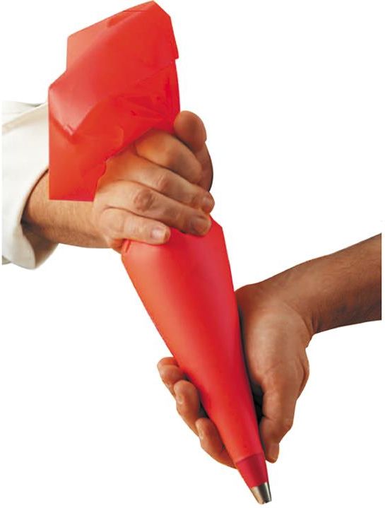 Silikonowy rękaw cukierniczy dł. 35 cm de Buyer Profesjonalne worki cukiernicze wielokrotnego użytku wykonane z silikonu są szczególnie elastyczne. Rękaw ma gładką powierzchnię wewnątrz, która ułatwia odpływ produktu i szorstką na zewnątrz dla lepszego uchwytu. Dzięki specjalnemu spawaniu torby gwarantuje wysokie bezpieczeństwo higieniczne. Łatwe czyszczenie Można myć w zmywarce. Są podszyte i wodoodporne. poliuretan - zwiększona wytrzymałość, giętkość i miękkość materiału - wewnątrz śliski dla łatwiejszego wyciskania, na zewnątrz szorstki dla pewniejszego chwytu - do temperatury maks. 60˚C