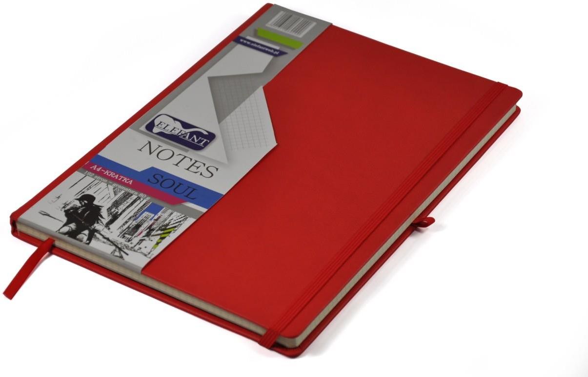 Notatnik biurowy twardy w kratkę zamykany na gumkę A4 Elefant SOUL Elegancki notatnik w wysokiej jakości skóropodobnej twardej okładce zaprojektowany zgodnie z aktualnymi trendami w designie i modzie. Notatnik firmy Elefant charakteryzuje się wysoką jakością papieru oraz okładki która ochroni wszystkie ważne notatki. Szczegóły produktu Notes formatu A4 w twardej skóropodobnej oprawie Zamknięcie za pomocą gumki, dzięki której notes nie otwiera się w torbie lub plecaku. Idealny do robienia notatek w szkole, na studiach lub w biurze, do wpisywania notatek biznesowych. Gramatura papieru: 80g/m2 Papier w delikatnym kolorze chamois Karki w czarną kratkę bez marginesu. Posiada taśmę, która pełni funkcję zakładki. Format A4 z zaokrąglonymi narożnikami. Kartki są zszywane i klejone. Wewnętrzna strona okładki z kieszenią. Kolor okładki: czerwony. Producent: Elefant