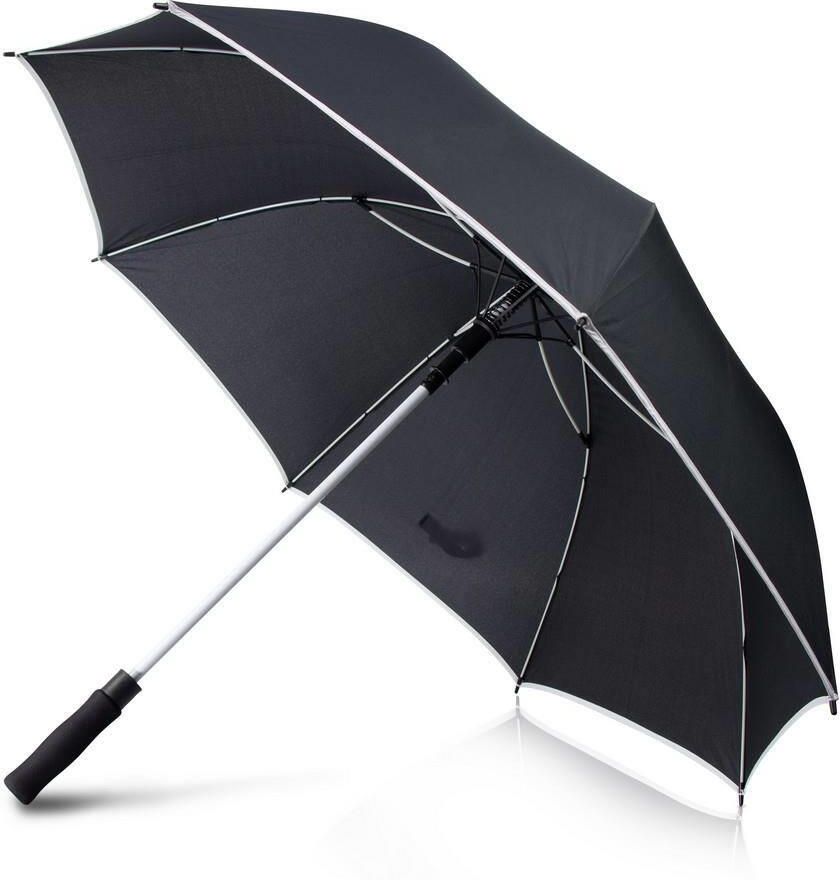Parasol automatyczny z białymi elementami, 8 paneli z białą lamówką, piankowa rączka, biały przycisk, metalowa rama w białym kolorze, białe żebrowanie z włókna szklanego, zapięcie na rzep