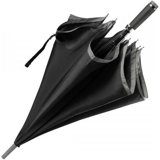 Duża parasolka Gear wyróżnia się nowoczesnym i eleganckim wyglądem. Rączka ma gumowe wykończenie i kontrastuje z kolorowym wykończeniem w postaci pierścienia czy ząbkowanej nakładki przy rączce. Materiał parasola jest dwukolorowy, z subtelną lamówką dla uzyskania wyrazistego charakteru. Ten parasol o dużej powierzchni dobrze kryje przed deszczem. W komplecie z etui na zamek błyskawiczny. Otwieranie/zamykanie jest automatyczne dla zapewnienia optymalnego komfortu. Dostępny w kolorze czarnym.