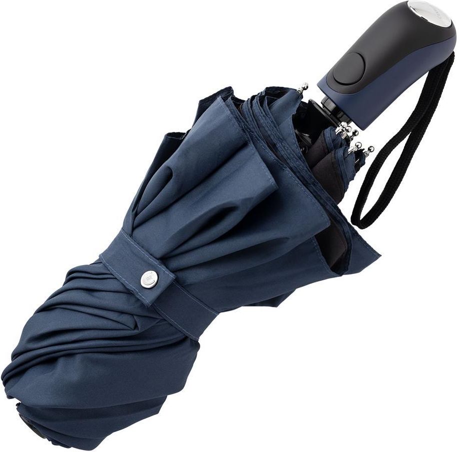 Parasol kieszonkowy `Irving` łączy w sobie kontrast dwóch kolorów - czerni i granatu. Podwójny daszek jest ciemnoniebieski na zewnątrz i czarny wewnątrz. Rączka parasola, wykończona gumą, zapewnia wygodny i pewny chwyt dla dłoni.