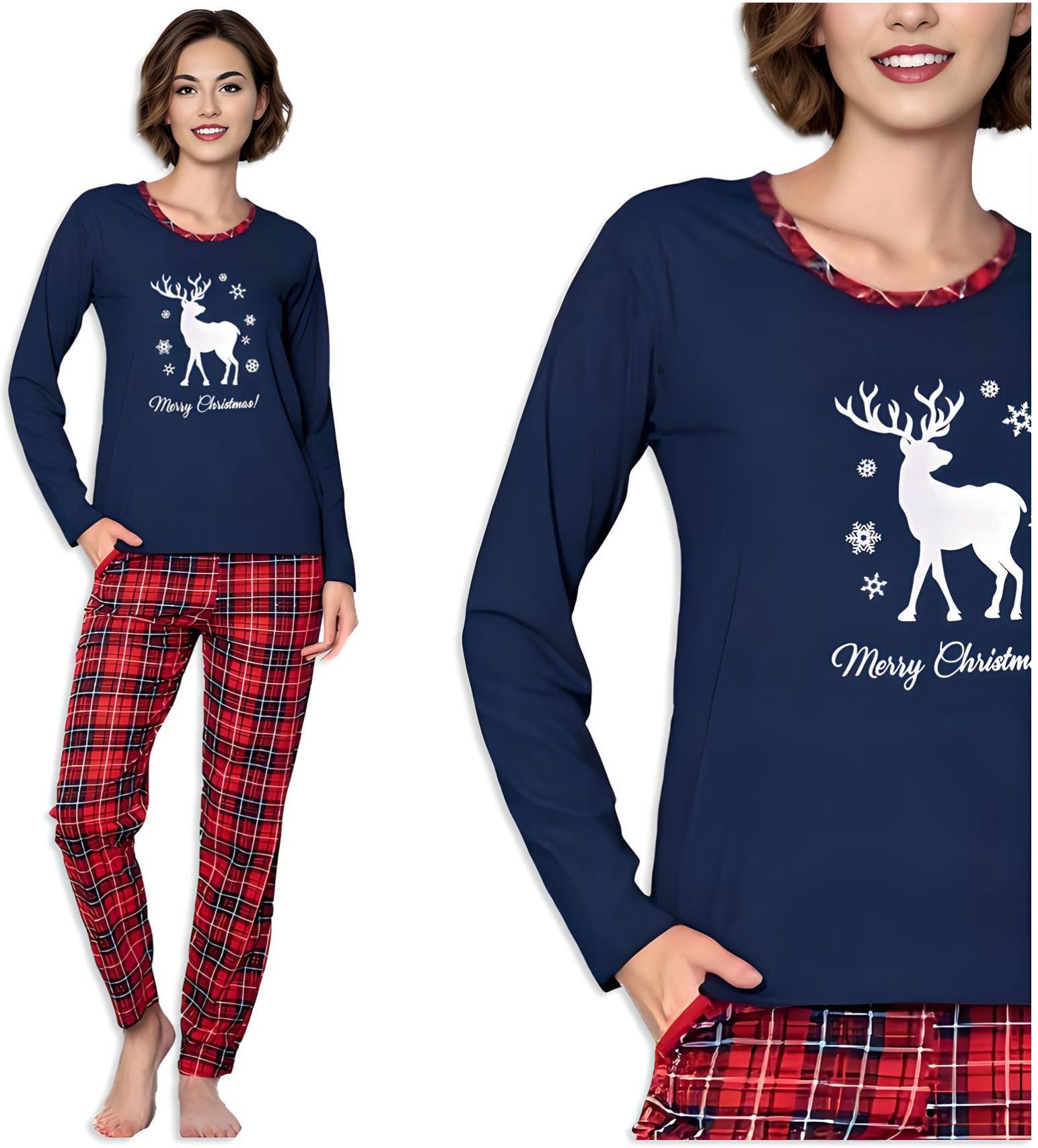 ŚWIĄTECZNA PIŻAMA DAMSKA Bawełniana piżama składająca się z czerwonej koszulki z długim rękawem, z nadrukiem w renifera i płatki śniegu i napisem Merry Christmas! Długie spodnie w kratkę. Specyfikacja 100 % bawełna (z metki) Kolor koszulki: granatowy Wymiary (XL) wymiary góry piżamy, mierzone na płasko, bez rozciągania obwód w biuście 104 cm długość całkowita 65 cm długość rękawa od wewnętrznej strony 49 cm wymiary spodni obwód w pasie 69 cm (bez rozciągania) obwód w pasie 100 cm (po rozciągnięciu) długość całkowita 96 cm +/- 2 cm Nie czekaj, kup już dziś! Piżama idealnie sprawdzi się jako prezent dla najbliższej osoby. ❤️ ✔️ Szukaj pozostałych kolorów w naszej ofercie.