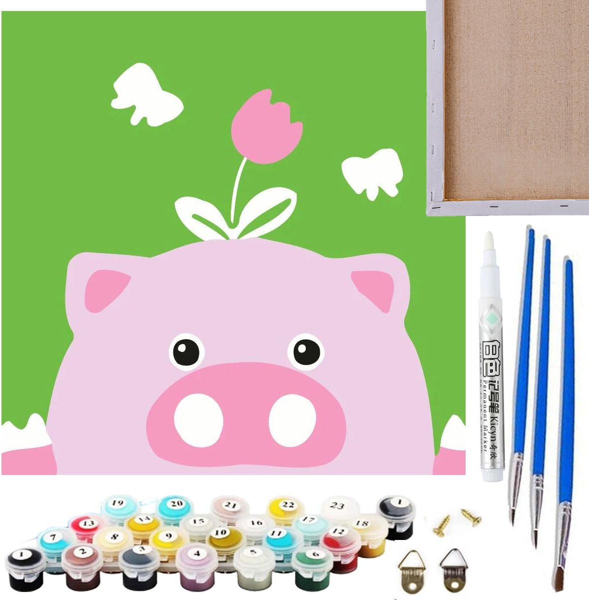 Zestaw Maluj po numerach Artnico 20x20 Świnka 3 x pędzle 11 x farbki 2 x haczyki do zawieszenia 2 x śrubki Biały marker Oryginalne opakowanie z uchwytem
