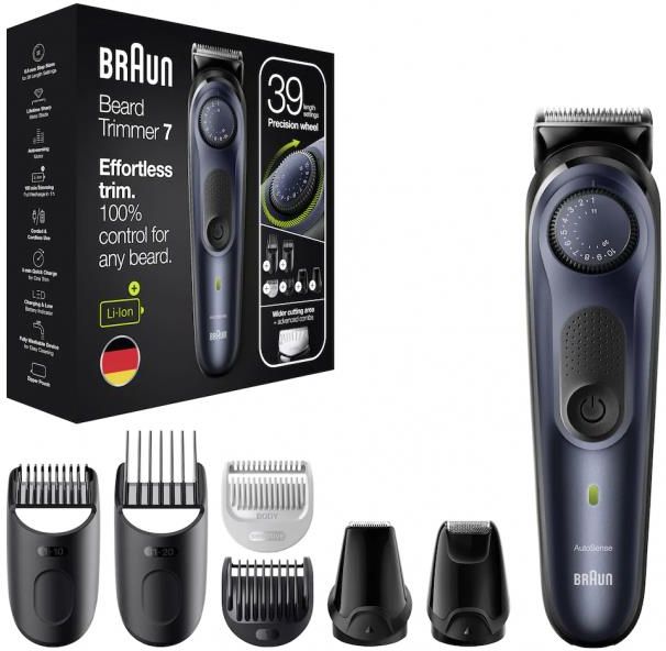 Braun BT7330 Trymer do brody Braun Beard Trimmer Series 7 BT7330. Bezproblemowe przycinanie. 100% kontroli nad każdym zarostem. Funkcja AutoSense dopasowuje się do rodzaju zarostu. Dodatkowe funkcje, takie jak zasilanie sieciowe/bezprzewodowe i wodoodporność. Osiągnij swój styl bez wysiłku dzięki trymerowi do brody i włosów Braun BT7 dla mężczyzn. Ten trymer do brody jest ostrzejszy, szybszy i wydajniejszy – z szerszym obszarem cięcia, który chwyta i ścina więcej włosów za każdym pociągnięciem. Trymer do brody 7 jest wyposażony w precyzyjne pokrętło z 39 ustawieniami długości, wytrzymałe, ostre metalowe ostrza i akumulator litowo-jonowy. Z zmywalną głowicą trymera i nasadkami.   Stworzony, aby służyć jak najdłużej Maszynka do przycinania brody dla mężczyzn ma ostre ostrza, które wytrzymują całe życie, umożliwiając łatwe, równomierne i spójne przycinanie brody o dowolnej długości. Ostrzejszy. Szybszy. Wydajniejszy. Trymer Braun Beard Trimmer 7 ma szerszy obszar cięcia niż jakikolwiek poprzedni trymer Braun, chwytając i ścinając więcej włosów za każdym pociągnięciem (w porównaniu z poprzednimi trymerami Braun) Precyzja i kontrola Precyzyjny grzebień z o 20% mniejszą ilością plastiku (w porównaniu z poprzednimi trymerami Braun) zapewnia bezwysiłkowe przycinanie Precission Wheel Precission Wheel trymera do brody oferuje 39 ustawień długości w krokach co 0,5 mm (od 0,5 do 20 mm). Precyzyjnie kształtuj, stylizuj i dopracowuj brodę, wąsy, bródkę lub zarost
