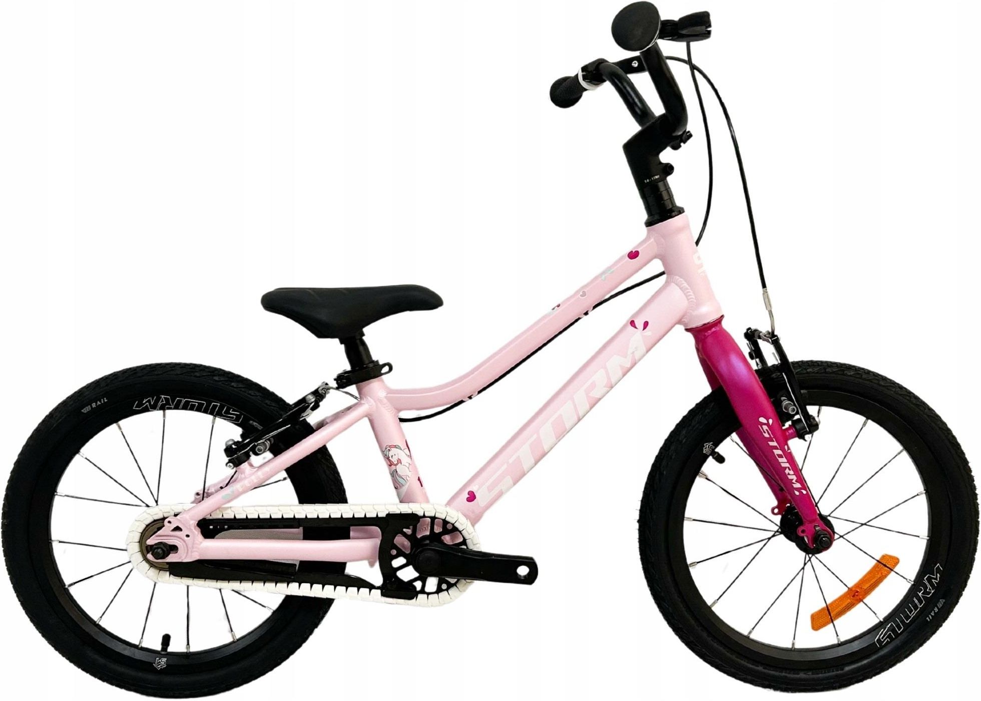ROWEREK DZIECIĘCY STORM POLLY LIGHT - rama 8,5", koło 16" - 6,5 KG MEGA LEKKI — TYLKO 6,5 kg! Storm POLLY to idealny wybór dla młodych rowerzystek, które cenią sobie komfort jazdy i lekkość sprzętu. Dzięki aluminiowej ramie i starannie dobranym komponentom rower waży zaledwie 6,5 kg! To ogromna zaleta – lżejszy rower to łatwiejsze manewrowanie i większa radość z jazdy. DLACZEGO WARTO? ? Super lekki - 6,5 kg - dziecko łatwo nim manewruje ? Jakość premium ? Dopracowane detale – rower idealnie dopasowany do dzieci ? Bezpieczne i skuteczne hamulce typu V-brake ? Szerokie opony - dobrze trzymają na różnych nawierzchniach ? Nowoczesny, sportowy design ? Urocze grafiki - jednorożec, babeczka, serduszka w pastelowych kolorach ? Bezpieczna geometria ułatwiająca wsiadanie i zsiadanie ? Ergonomiczne siodełko marki Storm dostosowane do wieku dziecka ? Idealny dla dzieci od ok. 4 do 6 lat Rozmiar ten będzie odpowiedni dla osób o wzroście 105 - 120 cm. Specyfikacja Rama: Aluminium Light Kolor: pudrowy róż / różowy mat Koła: 16” aluminiowe wzmacniane Piasta przód: Aluminium 28H Piasta tył: Aluminium 28H Opony: Vee Rubber Rail 16”x1.5 Hamulce przód: Alhonga V-brake Hamulce tył: Alhonga V-brake Dźwignie hamulca: Alhonga Kid Brake Lever Korby: Prowheel Kids 28T Suport: Łożyska maszynowe Łańcuch: 1/2"×1/8" Wolnobieg: 16T Łańcuch: KMC Z410 z osłoną z wysokogatunkowego tworzywa bezpiecznego podczas użytkowania Kierownica: Aluminiowa Wspornik kierownicy: Aluminiowy Wspornik siodła: Aluminiowy Stery: Ahead 1 1/8” Siodło: Storm Chwyty: Gumowe ergonomiczne Pedały: Tworzywo