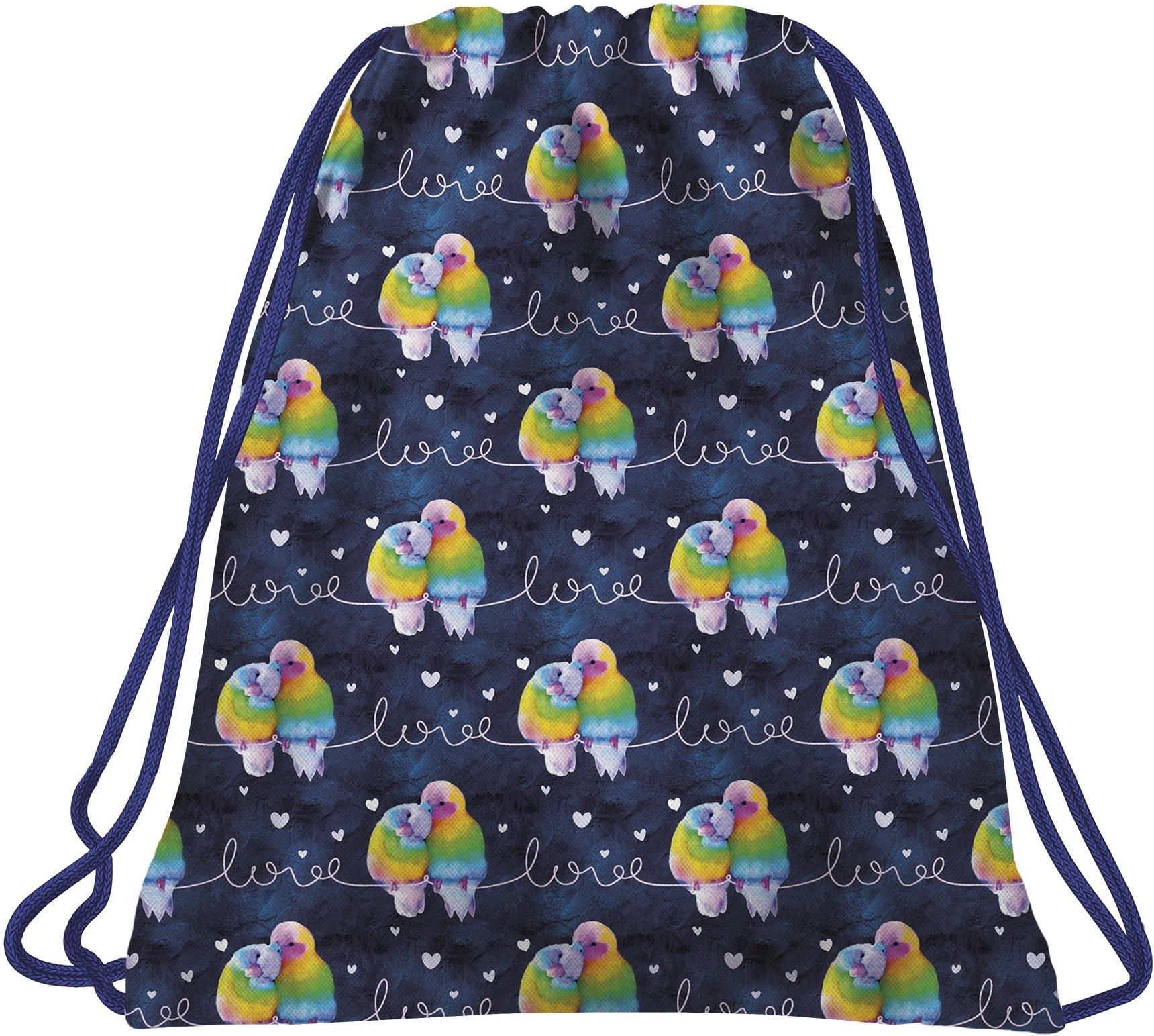 WOREK NA OBUWIE TYPU WORKO - PLECAK MARKI BACKUP W MODNYCH MŁODZIEŻOWYCH WZORACH Wielobarwne papużki, które łączy silna, miłosna więź, tulące się na tle głębi granatu. Romantyczny i kolorowy - taki właśnie jest worek na buty BackUP z kolekcji Love! Połączenie intensywnych barw zieleni, fioletu i …
