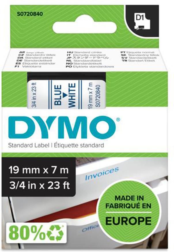 Taśma DYMO D1 - 19 mm x 7 m, niebieski / biały, S0720840 / 45804 Taśmy Dymo D1 zostały opracowane specjalnie pod kątem Twojej drukarki etykiet. Taśmy Dymo D1 oferują jakość i różnorodność niezbędną do wszelkich prac etykietowania - wewnątrz lub na zewnątrz pomieszczeń, w biurze, warsztacie, sklepie oraz w każdym innym miejscu. Taśmy standardowe D1 są usuwalne i nie pozostawiają śladów. Przyklejają się praktycznie do wszystkich czystych płaskich powierzchni, takich jak plastik, papier, metal, drewno, i szkło. Łatwo usuwalna perforowana warstwa zabezpieczająca usprawnia i przyspiesza naklejanie etykiet. Dzięki materiałowi z jakiego są wykonane, odporne są na temperaturę (od -18 do +90°C), również są odporne na wodę, oleje, smar i większość łagodnych rozpuszczalników. Powłoka etykiety jest odporna na promieniowanie UV światła słonecznego, dzięki temu etykiety nie blakną ani nie łuszczą się. Termo transferowa technologia druku nie wymaga dodatkowo stosowania tuszy ani tonerów. Symbol: S0720840 Klasa: oryginał. Typ: D1 standardowa. Materiał: poliestrowa. Kolor: niebieski napis na białym tle. Szerokość: 19mm. Długość: 7m. Kompatybilność: LabelManager 360D, 400, 420P, 450, 450D, 450 Duo, 500TS, PNP WiFi, PC, PC 2: LabelPoint 300, LabelPoint 350, LabelPoint 360, LabelWriter 400DUO, 450DUO. Rhino: ILP219, 4200, 5000, 5200, 6000. Produkcja: Belgia.