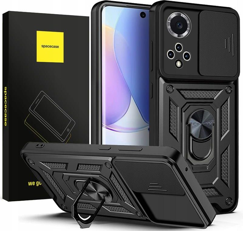 ETUI CASE CAMRING PANCERNE DO HUAWEI NOVA 9 Etui Spacecase CamRing Pancerne etui CamRing to doskonała ochrona Twojego urządzenia. Wbudowany przesuwny slider skutecznie zabezpiecza powierzchnię aparatu przed zarysowaniem lub potłuczeniem, dzięki czemu nie musisz obawiać się upadku. Wielofunkcyjny pierścień to idealne rozwiązanie dla każdego aktywnego użytkownika smartfona. Pozwala wygodnie oglądać wideo w dowolnej pozycji, działa jako uchwyt na palec, który znacznie poprawia chwyt oraz umożliwia montaż na samochodowych uchwytach magnetycznych. Nowoczesny design bardzo dobrze komponuje się z minimalizmem urządzenia. Wielofunkcyjny pierścień. Stanowi wygodną podstawkę do oglądania video oraz praktyczny zaczep na palec gwarantujący pewny chwyt. Dodatkowo umożliwia montaż na samochodowych uchwytach magnetycznych. Zabezpieczenie aparatu. Funkcjonalny ruchomy slider jest doskonałym zabezpieczeniem aparatu. Osłania szklaną powierzchnię kamery, która jest w dużym stopniu narażona na zarysowania i pęknięcia. Użytkownik jednym ruchem może zasłonić i odsłonić obiektyw podczas robienia zdjęcia. Skuteczna ochrona. Wysoka jakość użytych materiałów zapewnia skuteczną ochronę telefonu. Plecki wykonane są z twardszego tworzywa PC, a boki z elastycznego, amortyzującego upadki materiału TPU. Całość stanowi bardzo solidną, wytrzymałą obudowę. Pełna funkcjonalność. Za sprawą dopasowanych wycięć i funkcjonalnych osłon na przyciskach, użytkownik ma wygodny i swobodny dostęp do wszystkich interfejsów urządzenia. Nowoczesny i elegancki wygląd. Unikalny design i starannie wykonane wykończenia spełnią oczekiwania nawet najbardziej wymagających użytkowników. Wysunięte ranty brzegowe. Kładąc telefon wyświetlaczem w dół nie narażamy go na zarysowanie. Wystające ranty boczne zapobiegają bezpośredniemu przyleganiu do płaskich powierzchni. Ergonomiczny kształt, idealne dopasowanie. Przyjemnie leży w dłoni, nie ślizga się. W skład zestawu wchodzą 1x Etui Spacecase CamRing Kompatybilność Huawei Nova 9 Ochronny slider Funkcjonalny ruchomy slider jest doskonałym zabezpieczeniem aparatu. Osłania szklaną powierzchnię kamery, która jest w dużym stopniu narażona na zarysowania i pęknięcia. Użytkownik jednym ruchem może zasłonić i odsłonić obiektyw podczas robienia zdjęcia. Wielofunkcyjny pierścień Stanowi wygodną podstawkę do oglądania video oraz praktyczny zaczep na palec gwarantujący pewny chwyt. Dodatkowo umożliwia montaż na samochodowych uchwytach magnetycznych. Skuteczna ochrona Wysoka jakość użytych materiałów zapewnia skuteczną ochronę telefonu. Plecki wykonane są z twardszego tworzywa PC, a boki z elastycznego, amortyzującego upadki materiału TPU. Całość stanowi bardzo solidną, wytrzymałą obudowę.