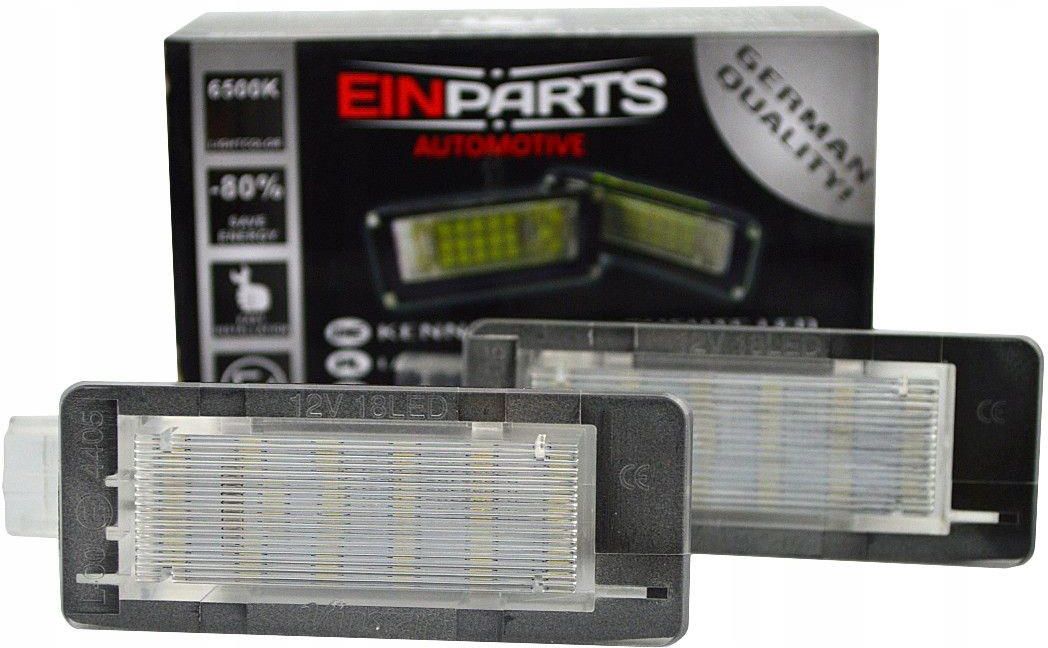 Lampki tablicy rejestracyjnej LED - EINPARTS EP92 Komplet 2 lampek LED do oświetlenia tablicy rejestracyjnej, zamiennik oryginalnie stosowanego oświetlenia, z homologacją z możliwością legalnego użytkowania na europejskich drogach. Dużo lepszy efekt podświetlenia tablicy, którego nie zastąpią żadne zwykłe diody SMD. CENA ZA KOMPLET - 2 SZTUKI EinParts Automotive – Niemiecka myśl techniczna EinParts Automotive to marka charakteryzująca się wysoką jakością oraz przystępną ceną oferowanych produktów. Wieloletnie doświadczenie w branży motoryzacyjnej pozwoliło specjalistom z EinParts Automotive oferować na rynku części i akcesoria od najlepszych europejskich i azjatyckich producentów w rewelacyjnych cenach. Staranny dobór producentów i materiałów, różne metody testów oraz kontrole procesu produkcji sprawiają, że produkty EinParts Automotive zadowalają nawet najbardziej wymagającego Klienta. Wiele produktów EinParts Automitive cieszy się popularnością wśród zachodnich konsumentów. Lampki tablicy rejestracyjnej dopasowane do Renault Captur 2013-... Renault Espace IV 2002 – 2010 Renault Fluence 2009-... Renault Latitude 2010 – 2015 Renault Modus / Grand Modus 2008 - 2012 Renault Scénic II 2003 - 2009 Renault Scénic III 2009-... Renault Zoe 2012-... Specyfikacja produktu Lampki zaprojektowane pod konkretny samochód Obudowa wykonana z najwyższej jakości plastiku (nie korodują) 18 diod LED 0,1W wysokiej mocy na jedną lampkę Wymiary lampki 78 mm x 32 mm x 32 mm (długość x szerokość x głębokość) Bezinwazyjny montaż "Plug and play". Po prostu wyjmij oryginalną lampkę z Twojego samochodu i zastąp ją naszą. Nigdy nie było prościej. Zalety lampek LED EINPARTS Ledowe podświetlenie tablicy rejestracyjnej, Całkowicie nowy wygląd: kolor biały zimny - temperatura świecenia 6000K, Niski pobór mocy, Diody SMD wysokiej klasy, Prosta instalacja, nie wymaga przeróbek, Daje twojemu pojazdowi nowoczesny wygląd,