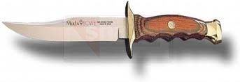 Nóż Muela Bowie Pakkawood 140mm (BW-14) BW-14 nóż ze stałą klingą, wykonany ze stali molibdenowo-wanadowej (MoVa). Doskonały nóż myśliwski, sprawdza się jako finka, podczas wypraw survivalowych lub poza miasto. Wytrzymały, bardzo ostry zniesie bez uszczerbku każde zadanie. Finka (puukko) nieodzowny element wyposażenia każdego harcerza, skauta, chętnie używana przez turystów. Charakteryzuje się stałą klingą o długości około 135 mm oraz rękojeścią wykonaną z tworzywa sztucznego lub drewna, zwykle zakończoną jelcem. Głownia - o profilu Bowie, grubości 4.3 mm. Wykonana z utwardzanej w przedziale 57-58 HRC, wytrzymałej molibdenowo-wanadowej stali nierdzewnej X50CrMoV15. Klinga pokryta eliminującą odblaski nierefleksyjną powłoką Satin Finish (pół-mat). Szlif wklęsły (Hollow Grind), ostrze gładkie typu Plain. Mosiężny obustronny jelec u nasady głowni zabezpiecza przed ześlizgiwaniem się dłoni na ostrze, stanowi pewne podparcie dla kciuka. Rękojeść - zakończona mosiężną głowicą. Profilowane okładziny z laminowanego drewna pakka w kolorze brązowym zapewniają pewny, bezpieczny chwyt. Etui - brązowe ze skóry z tłoczonym logo firmy. Pochwa posiada mocowanie do pasa lub oporządzenia umożliwiające noszenie noża w pozycji pionowej. Dane techniczne Numer produktu: BW-14 Rodzaj stali: X50CrMoV15 Długość głowni: 140 mm / 5.51" Grubość głowni: 4.3 mm / 0.17" Długość całkowita: 225 mm / 7.94" Waga: 225 g / 7.94 oz Rodzaj krawędzi tnącej: Plain Typ głowni: Bowie Rodzaj szlifu: Wklęsły Materiał rękojeści: Drewno Pakka (Coral pakkawood) Pochwa: Skórzana Producent: Muela, Hiszpania