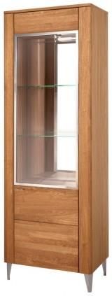 Witryna Latina 10 lewa drewniana Szynaka Meble Elegancka i estetyczna witryna Latina doskonale sprawdzi się w jadalni, salonie i pokoju dziennym. Częściowo przeszklone drzwi pozwolą wyeksponować ulubione dekoracje, książki lub zastawę stołową. Ciepły odcień miodowego dębu wprowadzi do wnętrza przytulną atmosferę. Wysokie nóżki nadają lekkości, a minimalistyczny, srebrny uchwyt doskonale zdobi całość. Mebel nie wymaga montażu. Front: lite drewno dębowe szczotkowane, szkło hartowane bezbarwne Korpus: zewnętrz: płyta meblowa w naturalnej okleinie dębowej; wewnątrz: płyta meblowa foliowana w dekorze drewnopodobnym Kolor: dąb miodowy Wykończenie: olej Wymiary: Szerokość - 70 cm Głębokość - 42 cm Wysokość - 200 cm Dodatkowo, do witryny można dodać oświetlenie LED do szklanych półek: Zestaw oświetleniowy podwieńcowy - 2-L-BC-1-0000-01; 1x oczko, oprawa metalowa, 1x transformator; światło ciepłe białe LED