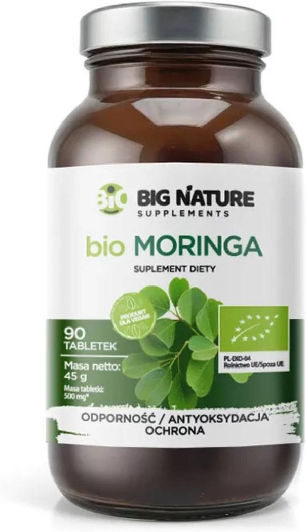 Big Nature Moringa - suplement diety 90 tab. Bio Producent: Big Nature EAN: 5905745621495 BIO MORINGA – SUPLEMENT DIETY naturalne wsparcie odporności, energii i ochrony antyoksydacyjnej BIO Moringa to suplement diety stworzony z liści Moringa oleifera – rośliny uznawanej za jedno z najbogatszych naturalnych superfoods. Zawiera szereg witamin, minerałów, przeciwutleniaczy i aminokwasów, które wspomagają organizm na wielu poziomach. Regularne stosowanie moringi może wzmacniać naturalne mechanizmy obronne, wspierać oczyszczanie organizmu, poprawiać poziom energii, kondycję skóry, włosów i paznokci, a także wspierać trawienie i metabolizm. Dlaczego warto wybrać BIO Moringę? Naturalne źródło witamin, minerałów i antyoksydantówWzmacnia odporność i siły witalneWspiera regenerację organizmu i poziom energiiPoprawia kondycję skóry i włosówWspomaga trawienie i detoksykacjęCzysty skład BIO Moringa polecana jest dla osób z obniżoną odpornością lub zmęczeniemdbających o wygląd skóry i włosówposzukujących naturalnego wsparcia antyoksydacyjnegoprowadzących aktywny tryb życia lub narażonych na stres Masa tabletki: 500 mg Składniki bio korzeń maca (Lepidium meyenii) w proszku Wartości odżywcze Składnik aktywny 1 tabletka 2 tabletki %RWS* Liście moringa w proszku (Moringa oleifera) 500 mg 1000 mg – *RWS – Referencyjna wartość spożyciaSposób przygotowania i przechowywania: 2 tabletki dziennie. Popić dużą ilością wody, najlepiej podczas posiłku lub po nim. Przechowywać w suchym i chłodnym miejscu.Ostrzeżenia i pozostałe informacje: Nie przekraczać zalecanej dziennej dawki. Suplement diety nie zastępuje zróżnicowanej diety. Kobiety w ciąży, karmiące piersią oraz osoby przyjmujące leki powinny skonsultować się z lekarzem przed zastosowaniem. Nie stosować w przypadku nadwrażliwości na którykolwiek ze składników. Informacja alergenna Produkt może zawierać: gluten, gorczycę, orzechy, sezam, seler i soję (ze względu na proces produkcji).