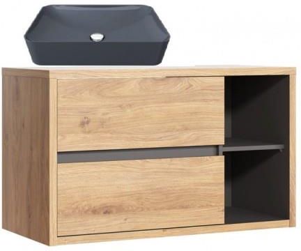 Szafka z szarą umywalką nablatową CREAVIT mat 100x46x60cm Dąb Grafit DEVON, Comad Kolekcja DEVON to połączenie prostej i stonowanej formy z imitującym drewno dekorem Dąb Shetland, pozwalające stworzyć harmonijne i wyjątkowe wnętrze. Całość dopełniają otwarte półki i wnętrza w kolorze Grafit. …