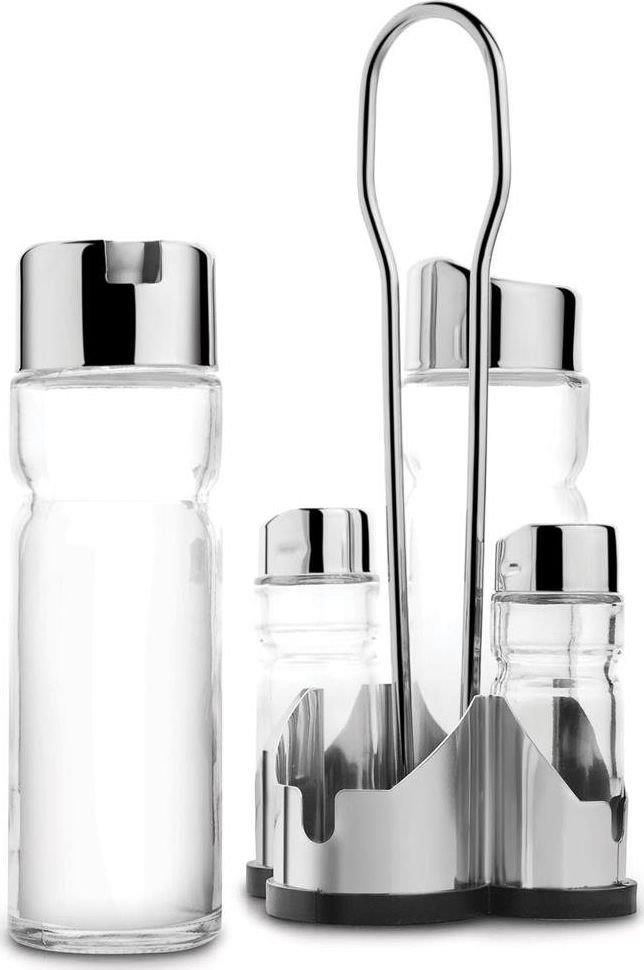 Przyprawnik (oliwa, ocet, sól i pieprz) Zestaw do przyprawiania, składający się z czterech części jest praktycznym i funkcjonalnym produktem z koszykiem wyposażonym w uchwyt to przenoszenia. Pojemniki są wykonane ze szkła i stali nierdzewnej i mogą być przeznaczone na sól, pieprz, oliwę i ocet. Łatwe w napełnianiu czyszczeniu. Można myć w zmywarce. Materiał: stal nierdzewna, szkło. Wymiary: 11x10,5x21,3cm.