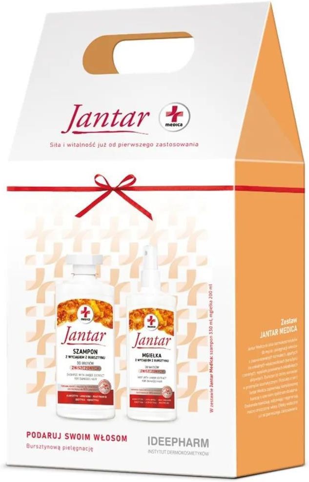 Jantar Medica Zestaw 1szt. to kompleksowa pielęgnacja oparta na właściwościach bursztynu, stworzona dla włosów zniszczonych i osłabionych. Zestaw Jantar do włosów obejmuje dwa pełnowartościowe produkty. Są to: szampon do włosów zniszczonych, który wzmacnia i regeneruje włosy oraz ułatwia ich rozczesywanie, mgiełka z wyciągiem z bursztynu, która wygładza włosy i zwiększa ich odporność na uszkodzenia. Jantar Medica Zestaw 1szt. wspiera odbudowę struktury włosa, poprawia sprężystość i nadaje naturalny blask.