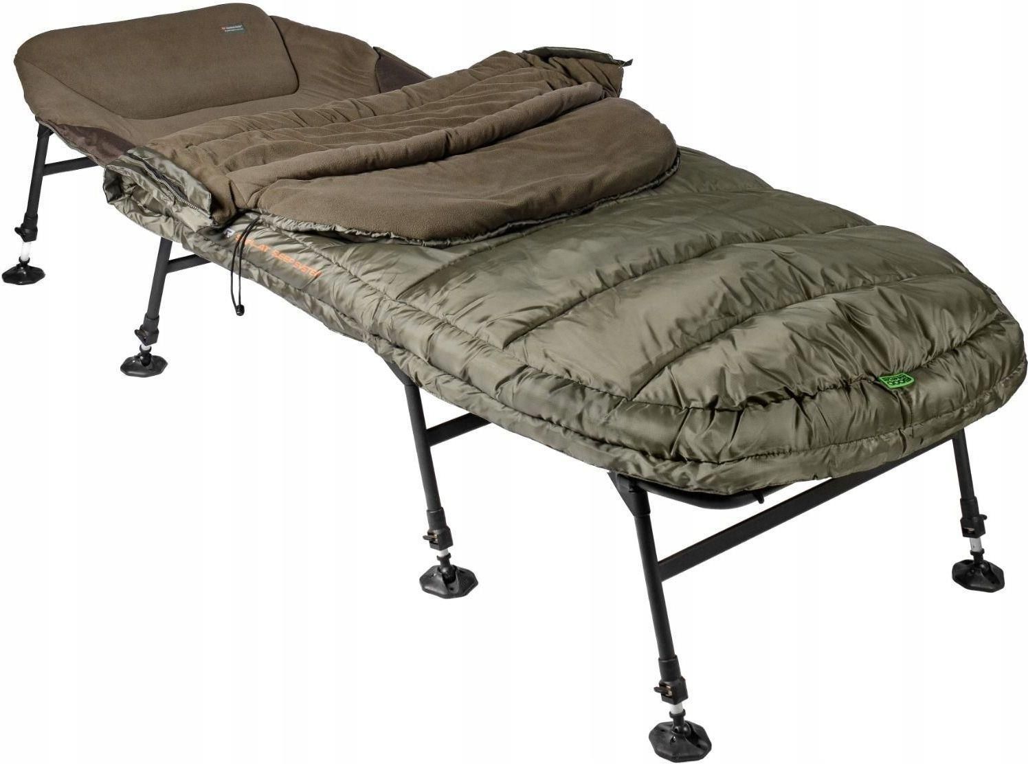 ŁÓŻKO TANDEM BAITS ENFORCER S-FLAT SF 8 NÓG To hybrydowy system do spania, który oferuje kompleksową wygodę na wędkarskich zasiadkach. Połączenie konstrukcyjnych rozwiązań łóżka z serii Enforcer S-Flat ze śpiworem Enforcer 4 Season Plus tworzy idealne zestawienie, zaprojektowane, aby zapewnić maksymalny komfort i funkcjonalność. Ten system do spania jest idealny dla każdego wędkarza szukającego wygodnego rozwiązania na długie nocne zasiadki. Kompleksowy Komfort: Model ten łączy w sobie łóżko i przytulny śpiwór, zapewniając optymalną wygodę i ciepło w każdych warunkach. Materac i Śpiwór w Jednym: Nowy rodzaj materaca z innowacyjnym naciągiem gwarantuje sztywność na całej długości i wsparcie odcinka lędźwiowego. Tkanina Oxford 600D jest niezwykle wytrzymała, a pokrycie materaca mikropolarem zapewnia maksymalny komfort podczas długich sesji wędkarskich. Solidna Konstrukcja Rama S-Flat: Stalowa, niskoprofilowa rama z ukośnymi wzmocnieniami gwarantuje wytrzymałość i długowieczność. Osiem Regulowanych Nóg: Pozwalają na stabilne ustawienie systemu na każdym terenie. Zaawansowany System Zawiasów: Ułatwia błyskawiczne składanie i rozkładanie, co usprawnia transport. Materiały Śpiwora: Zewnętrzna Powłoka: 210D polyester ripstop z laminatem DWR, gwarantujący wodoodporność. Wewnętrzna Warstwa: Micro fleece anti-piling, który zapewnia miękkość i ciepło. Wypełnienie: Dwuwarstwowy, formowany poliestrowy hollow fibre o gramaturze 250 g/m², zapewniający doskonałą izolację termiczną. Długość ramy: 210 cm Długość materaca: 225 cm Szerokość ramy: 70 cm Szerokość materaca: 80 cm Regulowana wysokość: 40-50 cm Maksymalne obciążenie: 150 kg Waga: 13,5 kg