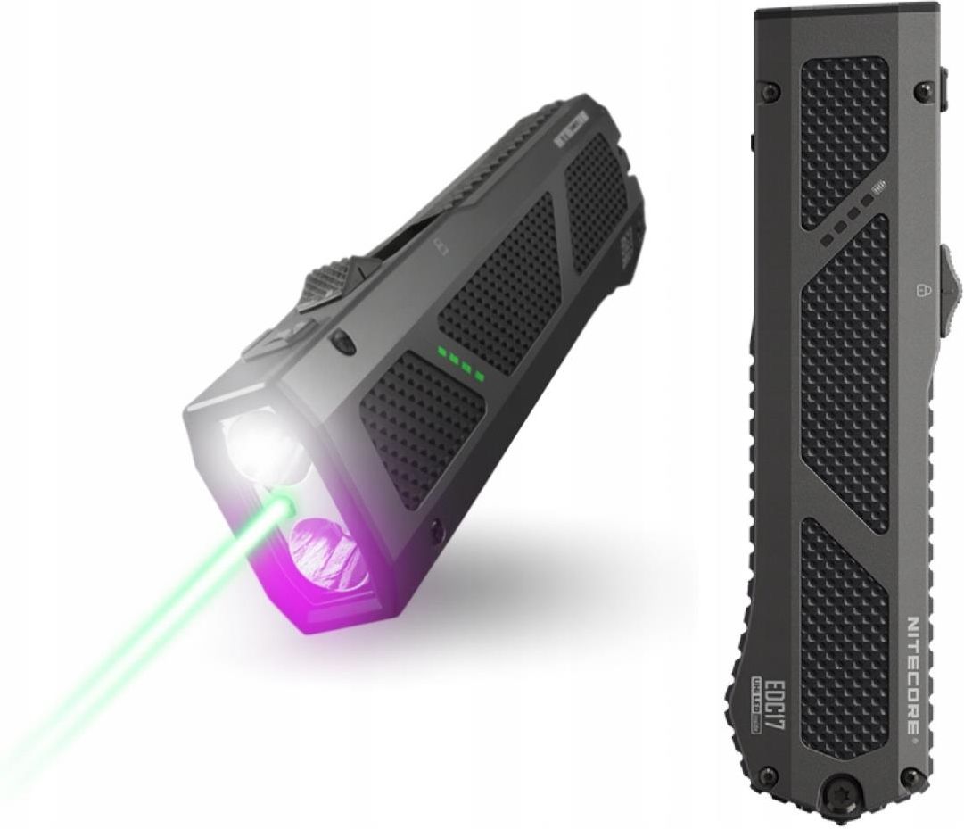 Latarka Nitecore EDC17 Nitecore EDC17 to ultracienka latarka EDC (Everyday Carry) zaprojektowana dla wymagających użytkowników, którzy potrzebują wszechstronnego narzędzia oświetleniowego w kompaktowej formie. Jej wyjątkowa konstrukcja łączy trzy źródła światła, czyniąc ją niezastąpioną w wielu sytuacjach. Wyposażona w diodę NiteLab UHi 25 LED, latarka generuje mocne białe światło o jasności 1500 lumenów, osiągając zasięg do 230 metrów i intensywność wiązki 12400 kandeli. Dodatkowo, EDC17 oferuje światło UV o mocy 1350mW, idealne do weryfikacji dokumentów czy wykrywania niewidocznych substancji, oraz zielony laser, który sprawdzi się jako wskaźnik czy narzędzie do sygnalizacji. Dzięki długiemu czasowi pracy do 260 godzin, latarka gwarantuje niezawodne działanie przez wiele dni. Ze względu na swoje kompaktowe wymiary 123mm x 32mm x 16mm i niską wagę 106 g, Nitecore EDC17 jest idealna do codziennego noszenia. Jest to doskonały wybór dla entuzjastów outdooru, kempingu, do zastosowań w sytuacjach awaryjnych oraz podczas prac konserwacyjnych, gdzie precyzja i różnorodność oświetlenia są kluczowe. Główne cechy Wielofunkcyjna latarka EDC z trzema źródłami światła: białym, UV i zielonym laserem. Mocne białe światło 1500 lumenów z zasięgiem do 230 metrów. Światło UV o mocy 1350mW do specjalistycznych zastosowań. Zintegrowany zielony laser dla precyzyjnego wskazywania. Kompaktowe wymiary (123x32x16mm) i niska waga (106 g) dla łatwego przenoszenia. Długi maksymalny czas pracy wynoszący do 260 godzin. Idealna do codziennego użytku, aktywności outdoorowych, awaryjnych i konserwacyjnych. Specyfikacja Maksymalna moc: 1500 lumenów Maksymalny zasięg wiązki: 230 metrów Maksymalna intensywność wiązki: 12400 cd Maksymalny czas pracy: 260 godzin Dioda LED: NiteLab UHi 25 LED Kolor wiązki: Białe światło, światło UV, zielony laser Wymiary: 123mm x 32mm x 16mm Waga: 106 g Aktywność: Sprzęt, Outdoor/Kemping, EDC, Awaryjne, Konserwacja