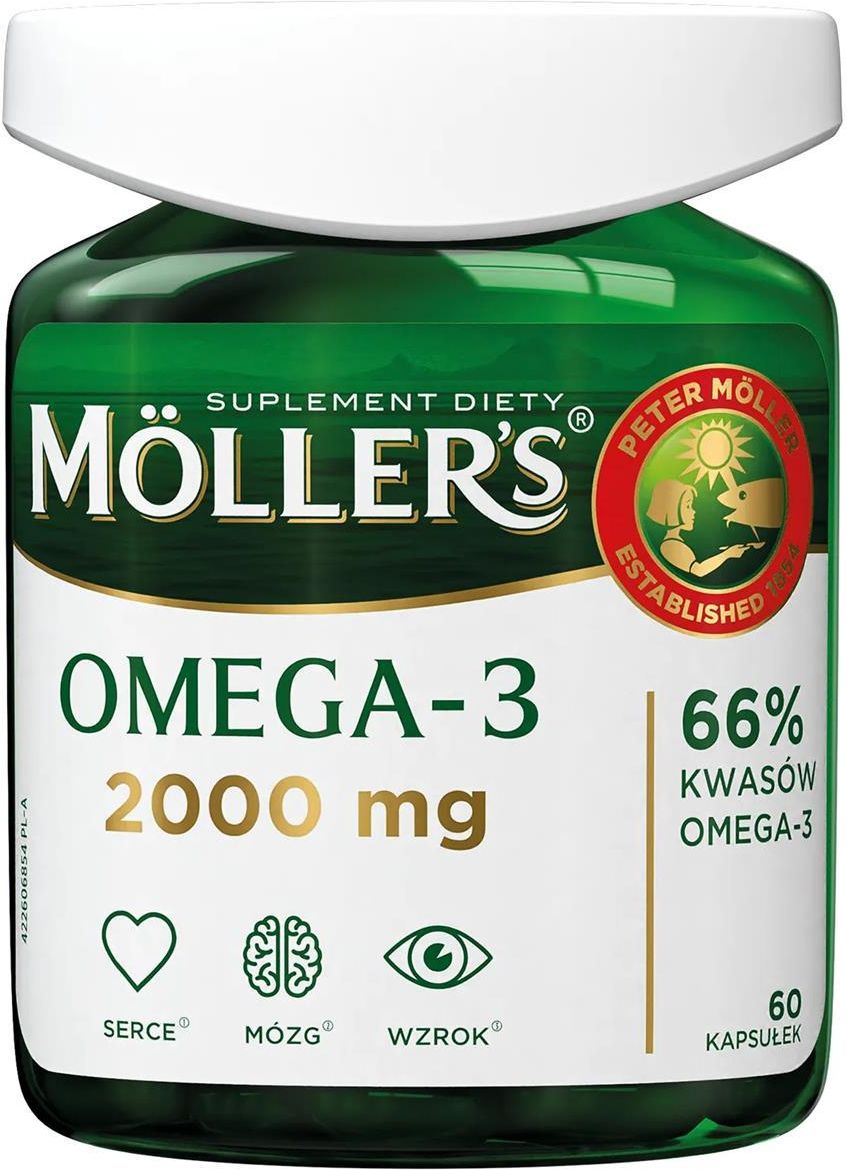 Möller’s® Omega-3 2000mg 60 kapsułek Suplement diety NAJWYŻSZA KONCENTRACJA OMEGA-3 OD MÖLLER’S Kapsułki z wysoko skoncentrowanym OMEGA-3 dla codziennego uzupełnienia diety w niezbędne nienasycone kwasy tłuszczowe Omega-3. MÖLLER’S® Omega-3 jest przeznaczony dla osób, które nie są w stanie zapewnić sobie właściwej podaży nienasyconych kwasów tłuszczowych wraz z pożywieniem, dorosłych (w tym kobiet w ciąży i karmiących), dzieci od 11 roku życia CO WYRÓŻNIA MÖLLER’S® OMEGA-3 2000 MG? 66% - wysoka koncentracja kwasów omega-3 Kwasy tłuszczowe Omega-3 w naturalnej postaci trójglicerydów, co zapewnia lepsze wchłanianie Wygodna forma kapsułek Stworzone z myślą o codziennym uzupełnianiu diety w niezbędne nienasycone kwasy tłuszczowe Omega-3 DLACZEGO WARTO WYBRAĆ KAPSUŁKI OD MÖLLER’S ®? Zaufaj liderowi i ekspertowi w kategorii OMEGA-3. Marka Möller’s® to jedna z najstarszych marek farmaceutycznych na świecie, z tradycją sięgającą 1854 roku. Od ponad 170 lat doskonalimy nasze procesy produkcyjne, aby zapewniać najwyższą jakość i spełniać oczekiwania konsumentów. ZWARTOŚĆ SKŁADNIKÓW I ICH DZIAŁANIE Kwasy Omega-3 wspomagają prawidłową pracę serca (DHA i EPA)1, mózgu i oczu (DHA)2. DHA i EPA pomagają w utrzymaniu prawidłowego poziomu trójglicerydów we krwi3. SKŁADNIKI Skoncentrowany olej z ryb, żelatyna (wołowa) substancja utrzymująca wilgoć (glicerol), przeciwutleniacz (mieszanina tokoferoli). Produkt dostarcza (w 1 kapsułce) Skoncentrowany olej z ryb 1000 mg Kwasy tłuszczowe Omega-3 660 mg, w tym: kwas dokozaheksaenowy (DHA) 240 mg kwas eikozapentaenowy (EPA) 320 mg Produkt dostarcza (w 2 kapsułkach) Skoncentrowany olej z ryb 2000 mg Kwasy tłuszczowe Omega-3 1320 mg, w tym: kwas dokozaheksaenowy (DHA) 480 mg kwas eikozapentaenowy (EPA) 640 mg Sprawdź również pozostałe warianty kapsułek od Möller’s®!* *na innych aukcjach Oficjalnego Sklepu Orkla Care S.A. Zalecane spożycie 1-2 kapsułki w zależności od potrzeb. Przechowywanie Przechowywać w temperaturze 5-25 stopni Celcjusza. Chronić od światła i wilgoci. Przechowywać w sposób niedostępny dla małych dzieci. Środki ostrożności Nie należy przekraczać zalecanej dziennej porcji do spożycia w ciągu dnia. Preparat nie może być stosowany jak substytut (zamiennik) zróżnicowanej diety. Zrównoważona dieta i zdrowy tryb życia są ważne dla prawidłowego funkcjonowania organizmu. Chronić przed bezpośrednim działaniem promieni słonecznych. Möller's® to jedna z najstarszych, norweskich marek. Marka Möller’s® założona przez farmaceutę Petera Möllera w 1854 roku to jedna z najstarszych marek farmaceutycznych na świecie. Pierwszym stworzonym przez markę produktem był tran Möller's, który do dziś jest najbardziej rozpoznawalnym w całym asortymencie marki. Dziś produkty marki Möller’s® można kupić w ponad 30 krajach w różnych formach podania (płyny – trany, kapsułki, żelki), tak aby każdy mógł dostarczyć swojemu organizmowi wystarczającą ilość kwasów omega-3 oraz witamin w sposób, jaki najbardziej mu odpowiada! DYSTRYBUTOR Orkla Care S.A. Ul. Fabryczna 5a 00-446 Warszawa *Möller's jest marką nr 1 wśród preparatów z kwasami Omega-3 w aptekach w Polsce. Na podstawie analizy wewnętrznej przeprowadzonej przez Orkla Care S.A. z wykorzystaniem danych ze źródła: IQVIA Poland Pharmascope za okres MAT 10/2024; Units; OTC3: 04G1 Omega-3 Fatty Acids, odzwierciedlające szacunki rzeczywistej aktywności rynkowej. Prawa autorskie IQVIA. Wszelkie prawa zastrzeżone. Przy dziennym spożyciu: 1250 mg DHA i EPA, 2250 mg DHA, 32g DHA i EPA. Suplement diety jest środkiem spożywczym, którego celem jest uzupełnienie normalnej diety. Suplement nie ma właściwości leczniczych.