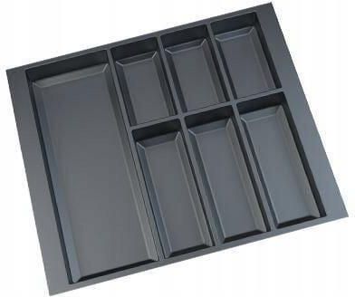 Wkład CLASSICO 600 do szuflady Merivobox o wymiarach 507 x 474/ antracyt wkład na sztućce do szuflad kuchennych Wytłoczka na sztućce i akcesoria kuchenne Classico jest dopasowana do szuflad Merivobox firmy Blum. Wkład pasuje do szuflad o zewnętrznej szerokości frontu 600 mm i głębokości prowadnicy 500 mm. Kolor wkładu antracyt. Wewnętrzne wymiary wkładu: szerokość: 507 mm, długość/ głębokość: 474 mm, wysokość: 53 mm. Wkład do szuflady wykonany jest z bardzo dobrego jakościowo, wytrzymałego tworzywa sztucznego, bezzapachowego, o grubości 2 mm. Solidny, odporny na odkształcenia i pęknięcia, jest bardzo lekki. Jest łatwy do czyszczenia, gładka powierzchnia wkładu nie „przyjmuje brudu”, nie widać na niej smug czy zarysowań . Jest bardzo estetycznie wykonany i bardzo ładnie wygląda w każdej szufladzie nie tylko w nowoczesnych meblach ale również w szufladach bardziej tradycyjnych. Praktyczny wkład do szuflady pozwoli na utrzymanie porządku i szybkie odłożenie umytych sztućców na właściwe miejsce . Przy podanej szerokości do dyspozycji mam 7 komór. Trzy mniejsze komory posłużą do przechowywania łyżeczek, widelczyków czy innych drobnych akcesoriów np.: zaparzacza do herbaty, trzy większe komory świetnie zorganizują przestrzeń na łyżki stołowe, noże i widelce, natomiast największa szeroka komora idealna będzie do dużych łyżek do mieszania potraw, szczypców, łopatek czy chochli. Wymiary komór (komory posiadają kształt zbliżony do trapezu): 1x komora duża 430x160 mm (wymiar u góry komory), 400x130 mm (wymiar na dnie komory), 3x komory średnie 250x90 mm (wymiar u góry komory), 220x65 mm (wymiar na dnie komory), 3x komory najmniejsze 170x90 mm (wymiar u góry komory), 145x65 mm (wymiar na dnie komory). Do wkładu polecamy profile wykończeniowe na boki wkładu (profile do dokupienia, nie wchodzą w komplet z wkładem). Parametry techniczne Wykończenie Kolor antracyt Wymiary Wysokość 53 mm Szerokość 507 mm Głębokość 474 mm 07.60141.AL